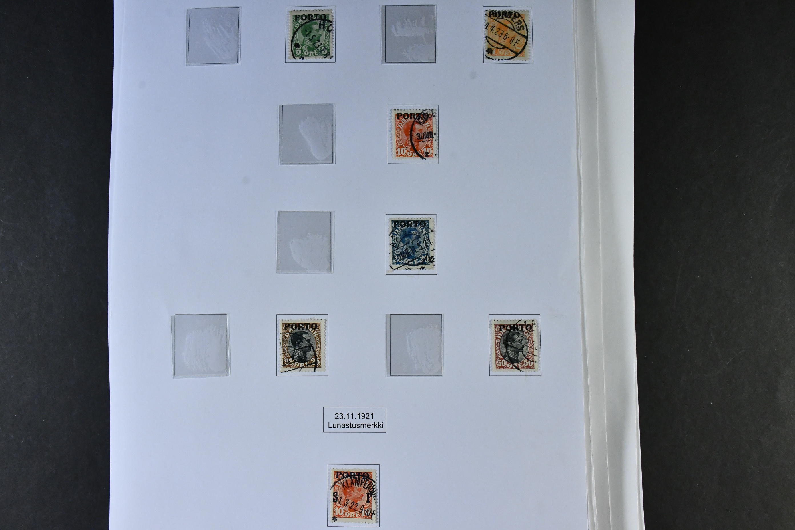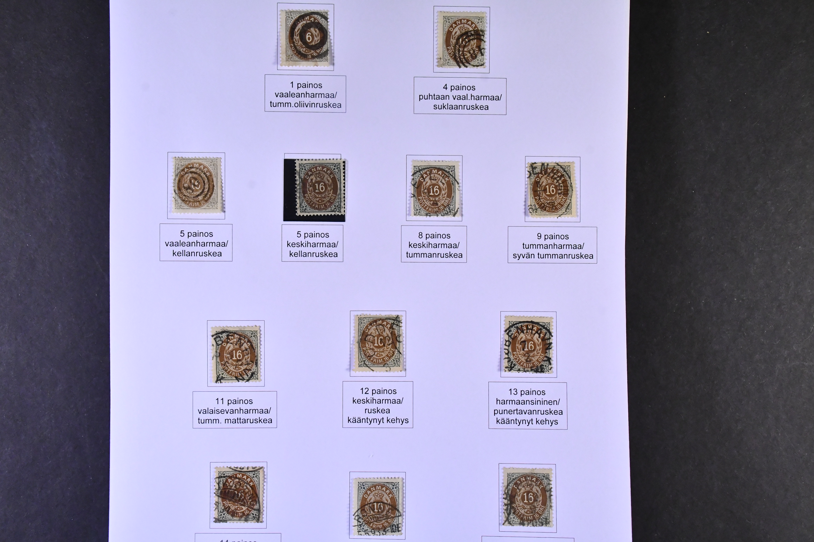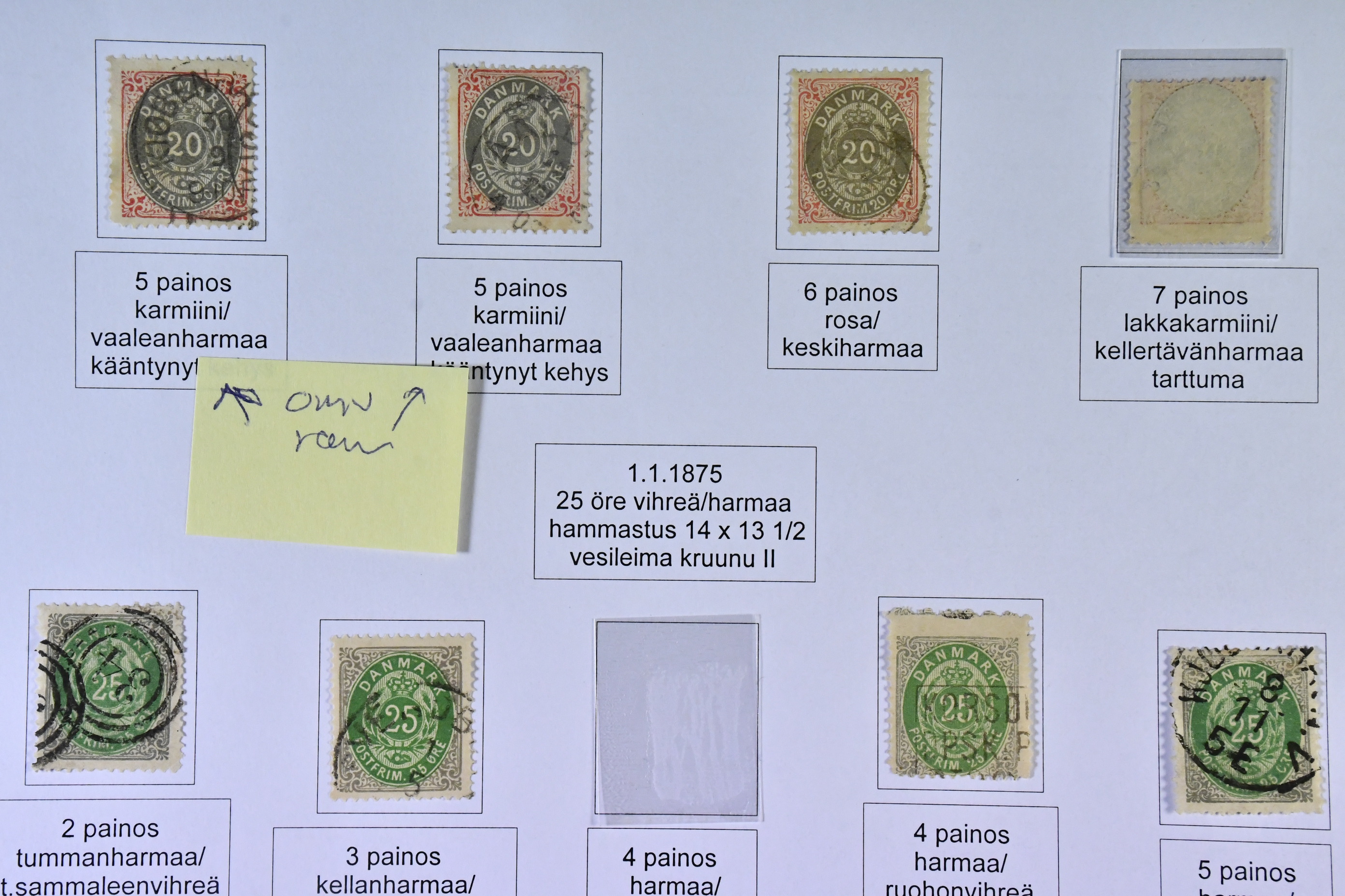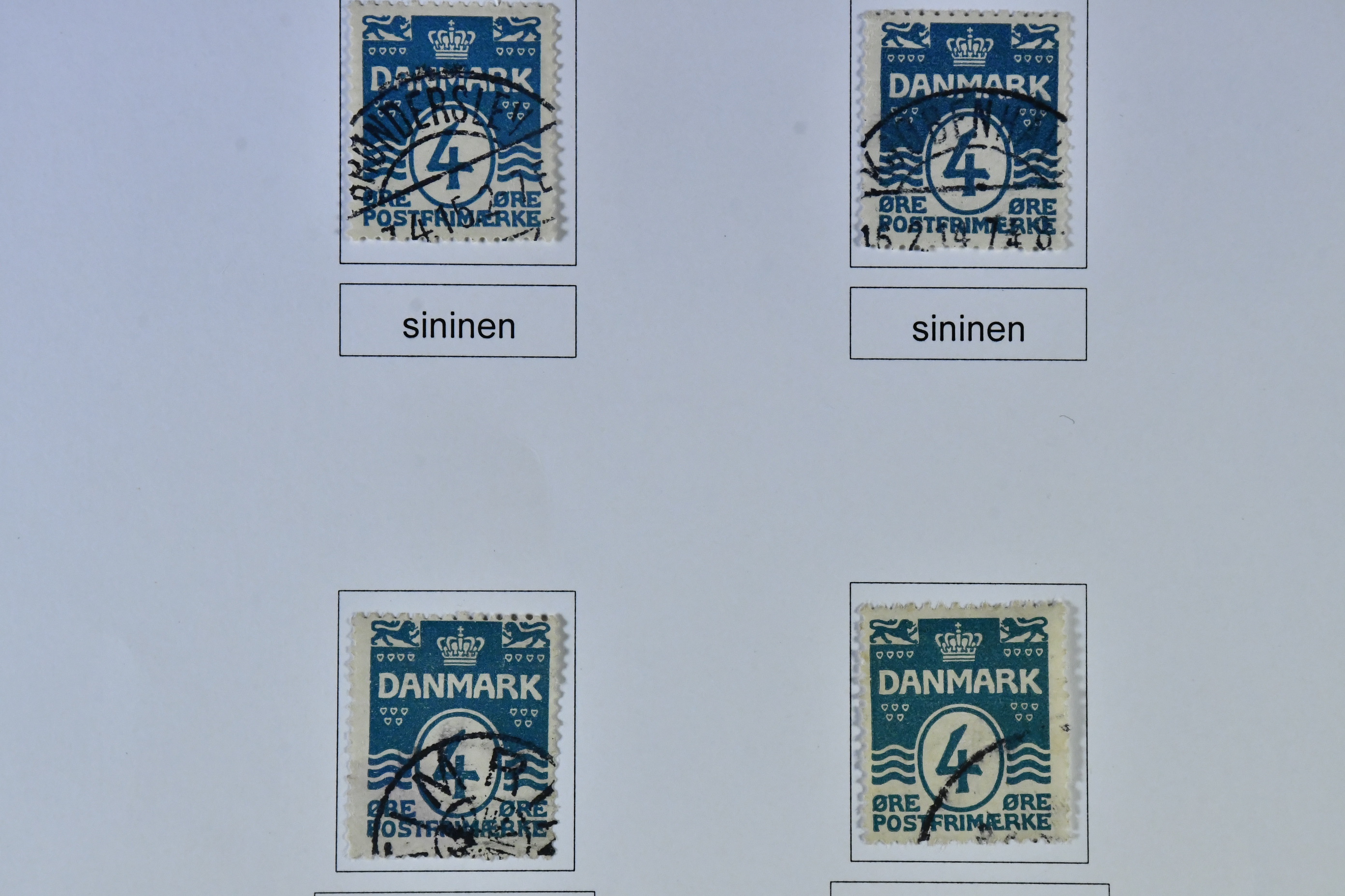 Denmark. Collection mostly used 1851-1940 on leaves. MOUNTED EXHIBITION COLLECTION (Finnish text) with covers removed but stamps present inclduing many better copies, e.g. large amount of Skillings, inverted frames, several 5kr GPO, overprinlt stamps, some unused etc, good oportunities to find shade, varieties etc! All important pages at www.philea.se, in addition about 40 apparently less important pages.