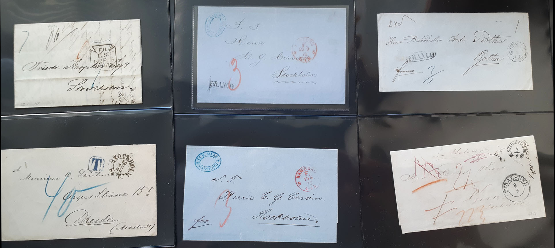 Sweden. Prephilately, lot on visir leaves. Mostly FOREIGN-RELATED unstamped letters/covers sent to/from Finland, France, Germany, Great Britain, Norway and USA, 1840s–1880s, respectively. (28)