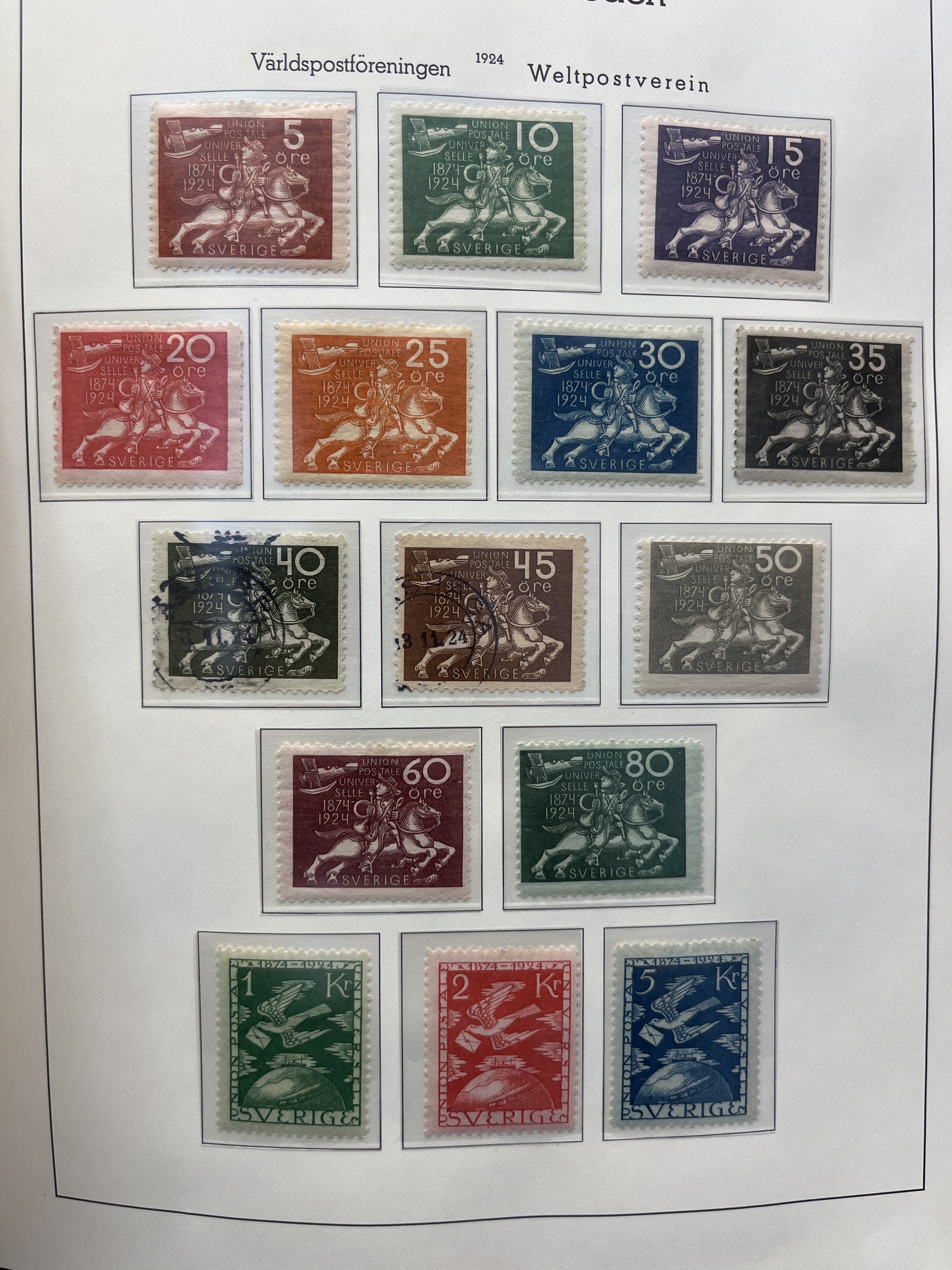 Sweden. Collection mostly used 1855–1969 in Leuchtturm album with stamp mounts. Well fild collection with e.g. 1924 year sets compl. Mostly fine quality.