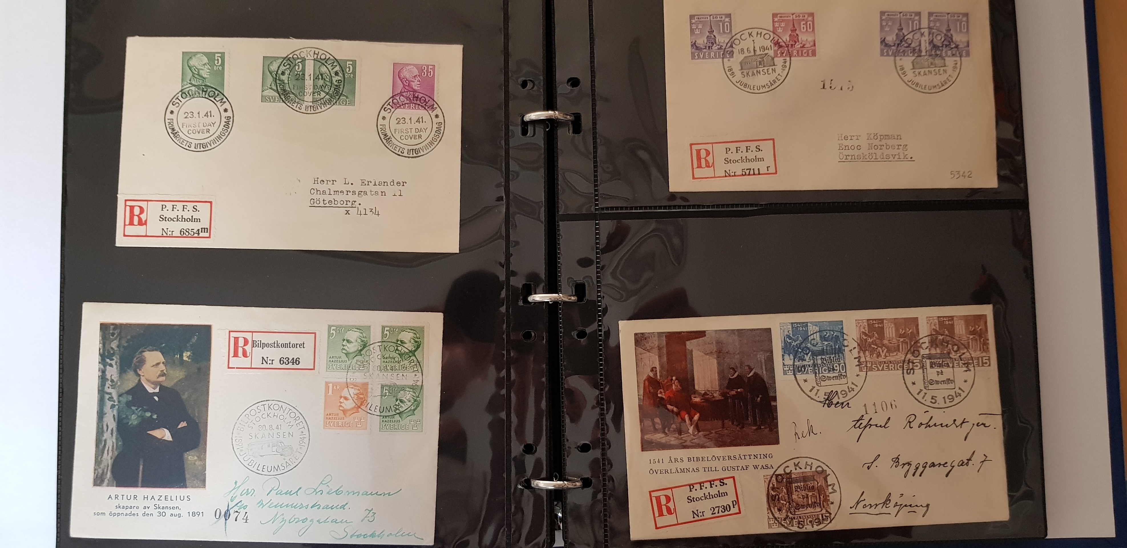 NORDIC COUNTRIES. FDCs, accumulation 1930–2015 in box. In this assembly of four albums, one contains fairly old FDCs with some valuable ones and the other three contain newer FDCs from Sweden, Norway and Iceland. Please see a selection of scans at www.philea.se. Mostly fine quality. Approx. 8 kg.