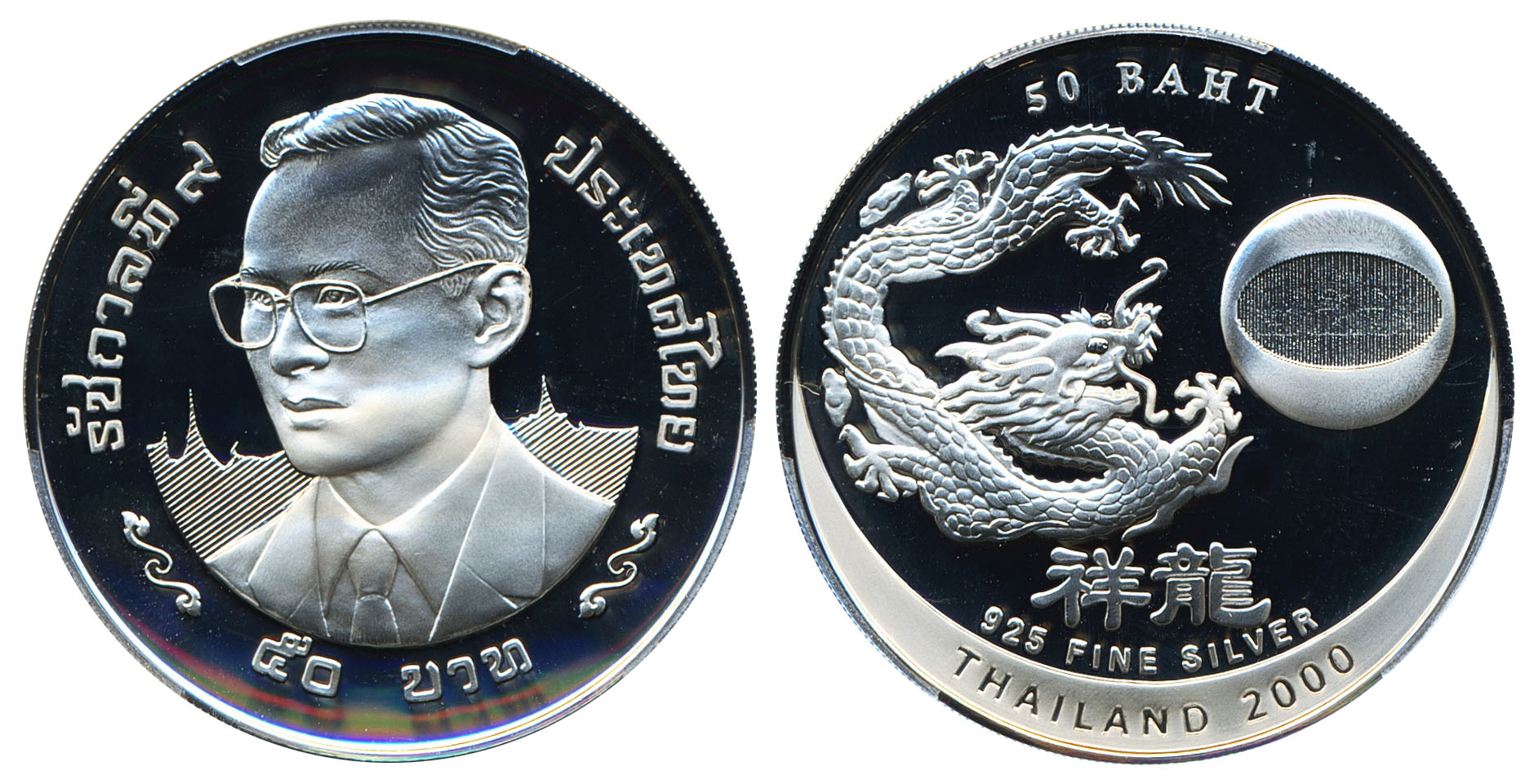 Coins, Thailand. KM 353, 50 baht 2000. Lunar series, Dragon with latent pearl. Mintage 8500. Graded by PCGS as PR69DCAM. Proof.
