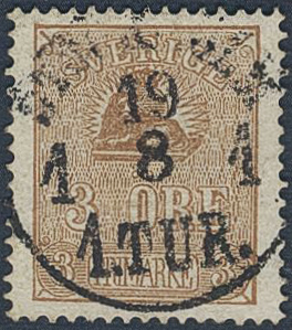 Sweden. Facit 14Bd used, 3 öre orange-brown, type II. EXCELLENT cancellation STOCKHOLM 19.8 1.TUR.