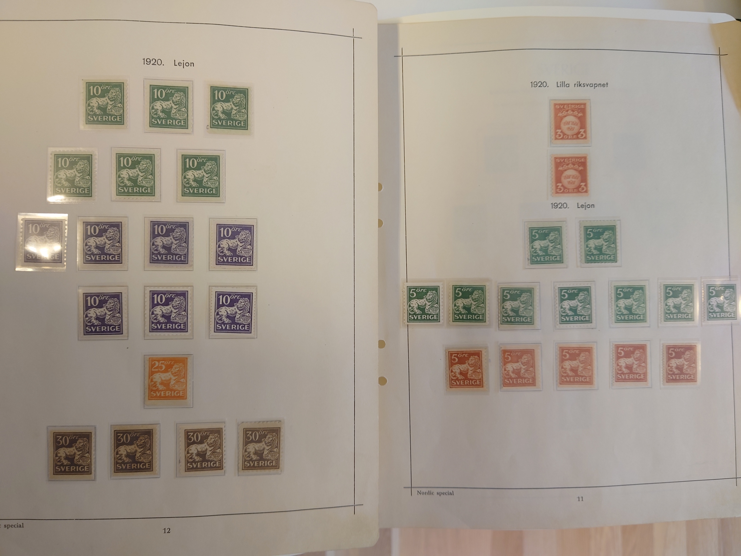 Sweden. Collection mostly ★★ 1855–1969 in Leuchtturm album with stamp mounts. A very nice well filled collection of unused stamps. Unfortunately are the skillings reprints except one 4sk. GV Medallion 55 and 80 öre are also unfortunately missing. Several issues with duplicates. Good section 1920s-1940s but some of the 3+4 (BC) and 4+3 (CB) are cut into the edge. Also official issues except perf 14, postage due and some military reply-stamps (incl a M1). Please inspect. Please see a selection of scans at www.philea.se. In the beginning mixed quality, later fine.