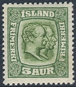 Iceland. Facit 94 ★★, 1914 Two Kings 5 aur green, watermark cross. SEK 2800