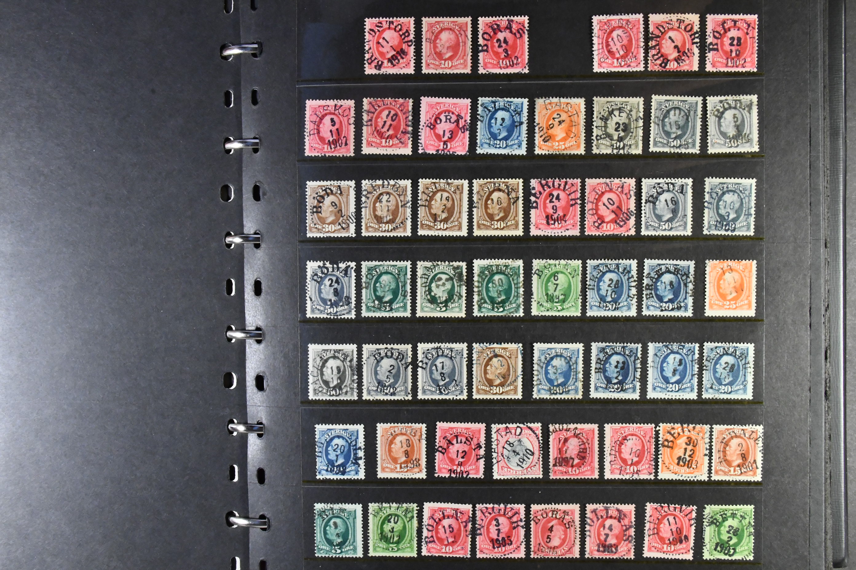 Sweden. Collection/accumulation used 1891–1911 on visir leaves. Oscar II, copperplate recess. City/village cancellations organized according to the first letter in the name. Many fine–EXCELLENTcancellations. Please see a selection of scans at www.philea.se. Somewhat mixed quality. (>2000)