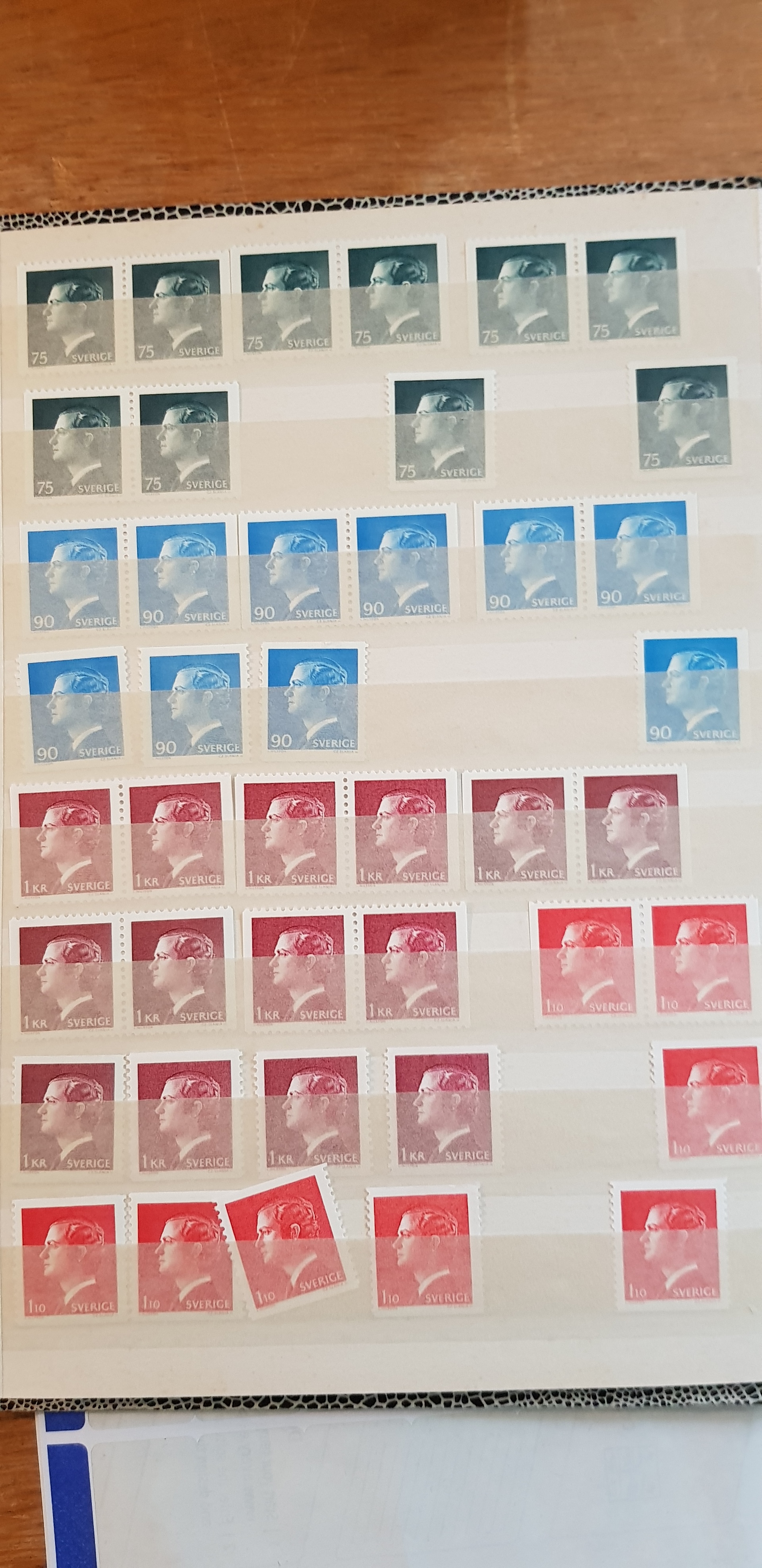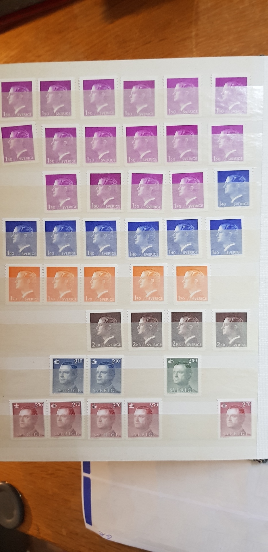 Sweden. Face value, accumulation 1970–2003 in box. Two stockboxes and one Facit album with unused stamps of a face value 5334 SEK, some Letter stamps included. Please see a selection of scans at www.philea.se. Fine quality.