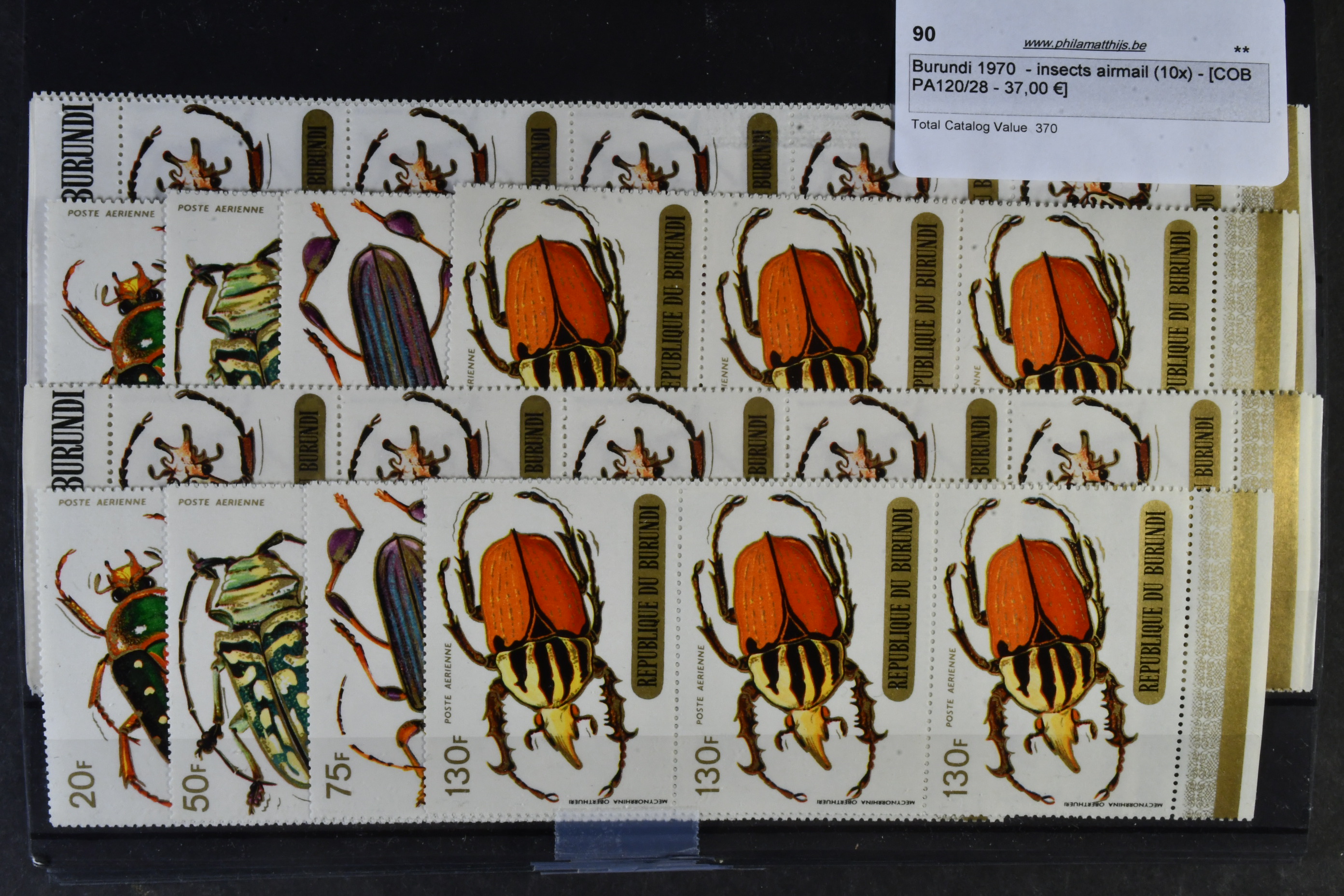 ALL WORLD. Accumulation ★★ modern. Worldwide thematics/flowers, butterflies, marine life, etc – An outstanding, superb MNH stock with everything in complete sets inc se-tenants, miniature sheets, etc from the 1960s into the 2000s. Highlights include Angola 2004 crop plants Mi #1724/27, Burundi Mi #2748/9 (cat € 60 a set), fish #319 to 342 (€85 per set), flowers Michel #244/49 (€ 50 a set), entomology air mail Mi #120/26 (€ 37 a set) and much more. Other countries include Comoros sea divers, Congo flowers of 2002 miniature sheets and sets, etc. Many of the expensive sets are here in quantity and everything has been neatly identified, the minimum catalogue value is at € 27,500+++ (well over $30,000), all the expensive sets here are by the dozens, some even more such as the large beetles of Burundi, a country that has very low printing numbers on all these issues. An outstanding opportunity to buy a great stock, ready to sell of some of the best sets of these topics.