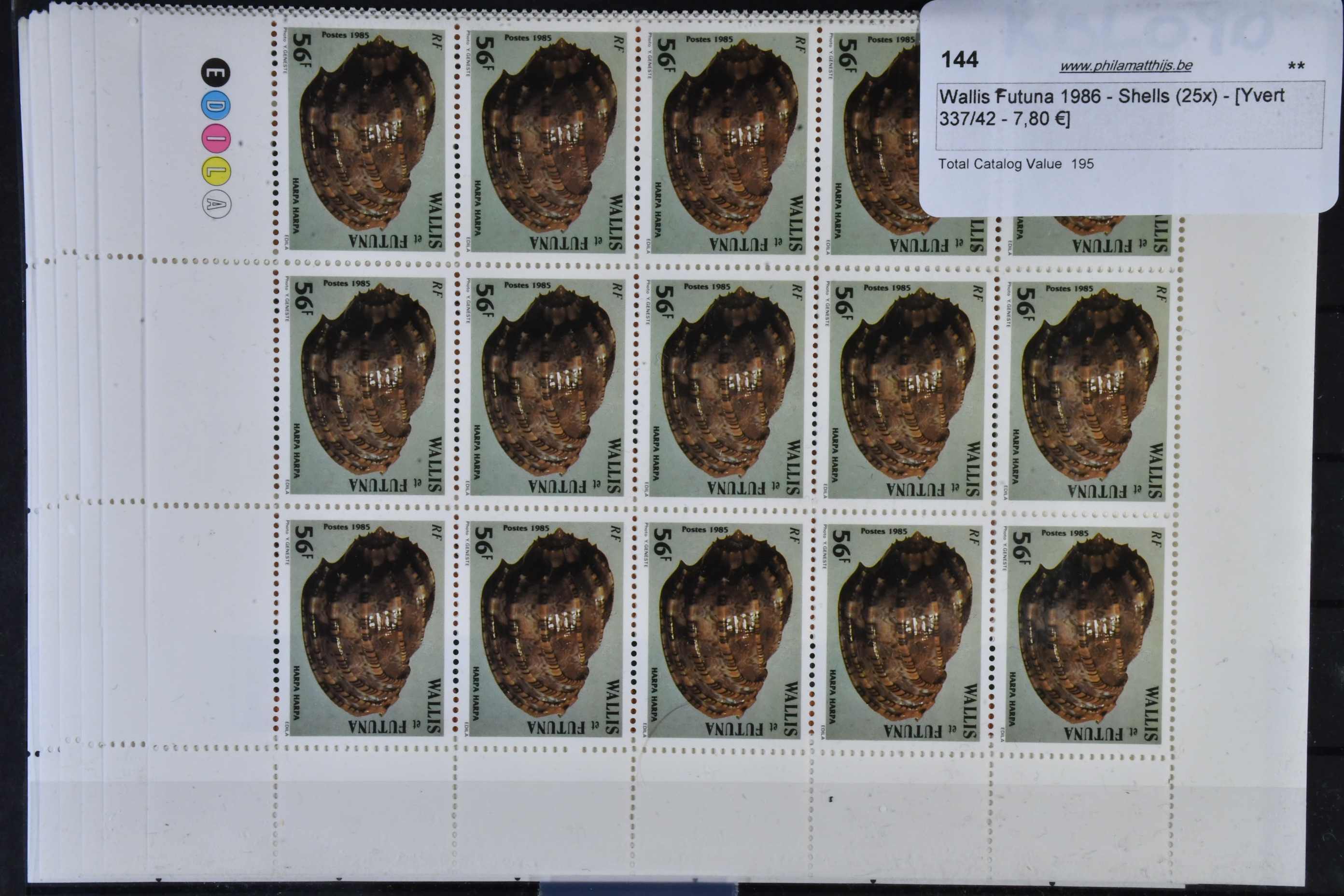 Wallis and Futuna. Accumulation ★★ 1970s–80s. A ready to sell stock of this popular Pacific Island French colony. Everything here is in complete sets and has for example has the Painting issues of 1979, Flower air mails of 1981, Marine Life, Orchids and Shells 1982/3, further Seashell sets of 1985, etc, the Football/Soccer issue of 1986, Butterflies 1987, etc. We estimate the catalogue value to be well over €8500++. Many of the better sets are by the dozens, if not more. An opportunity for a dealer of this ever popular French Polynesian area.