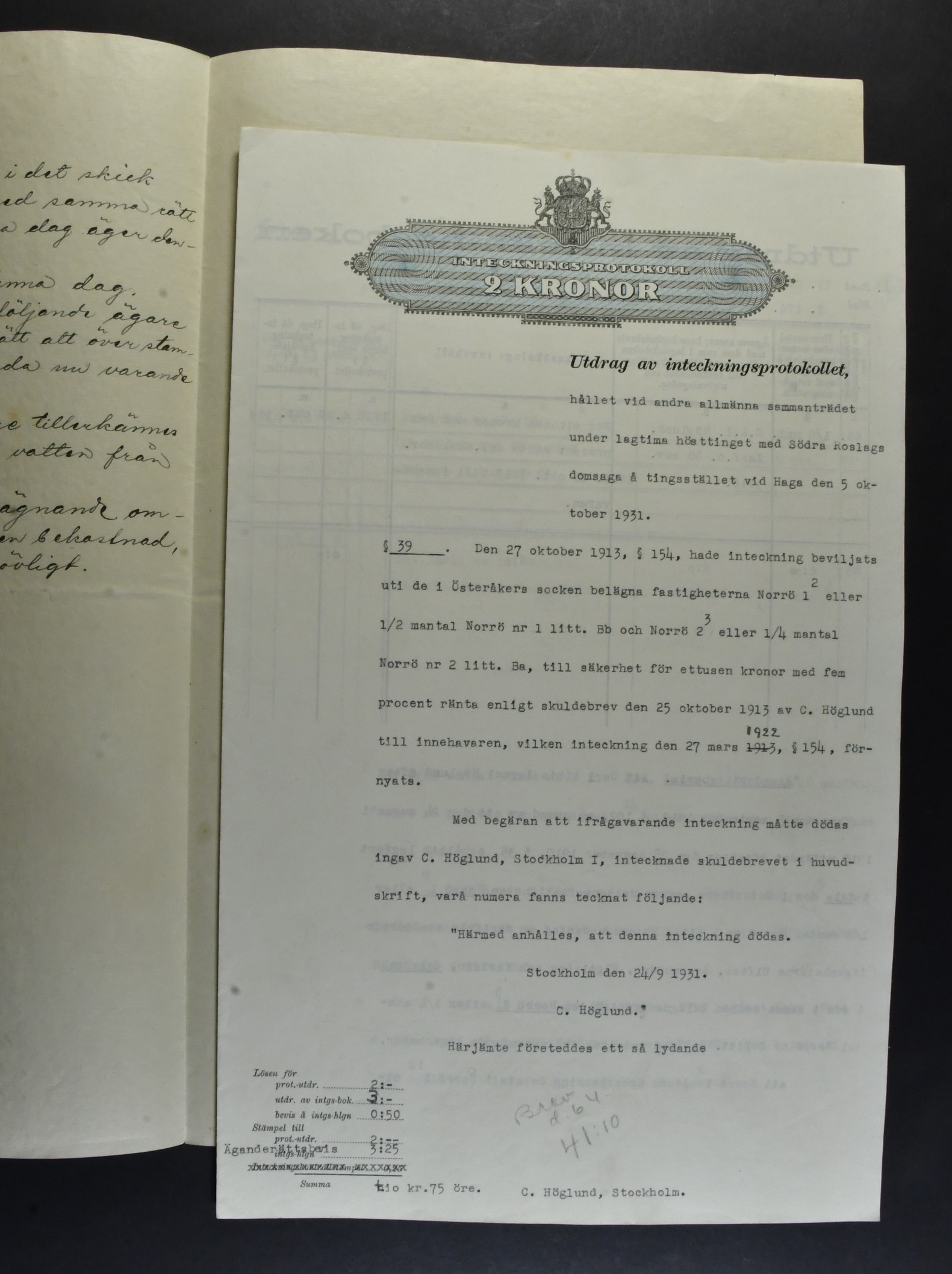 Sweden. Revenue stamped papers, lot. MORTGAGE PROTOCOL. 1 kr: 1928, 1929 and 1930 (2), whereof several with a Stockholm 5,50 kr Municipal Revenue stamp affixed. 2 kr: 1929 and 1930. All on Tumba paper, All six are complete two pages in Very fine condition. A rare compilation to obtain. The entire lot is presented at www.philea.se. (6)