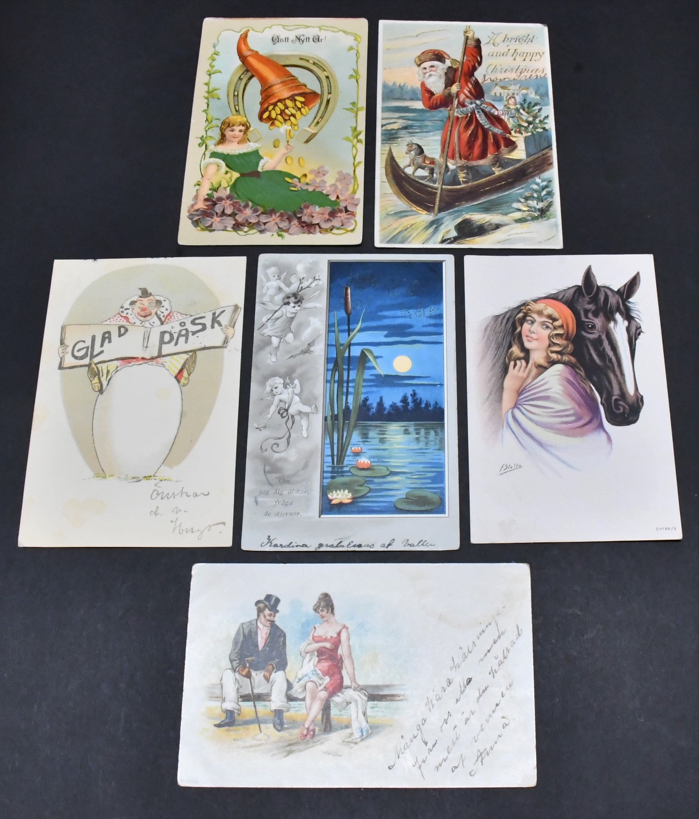 Sweden. Picture postcards. GREETING CARDS, Christmas, romantic cards etc. All in the old size and mainly before 1920, many nice cards, both Swedish and foreign, in box (900).