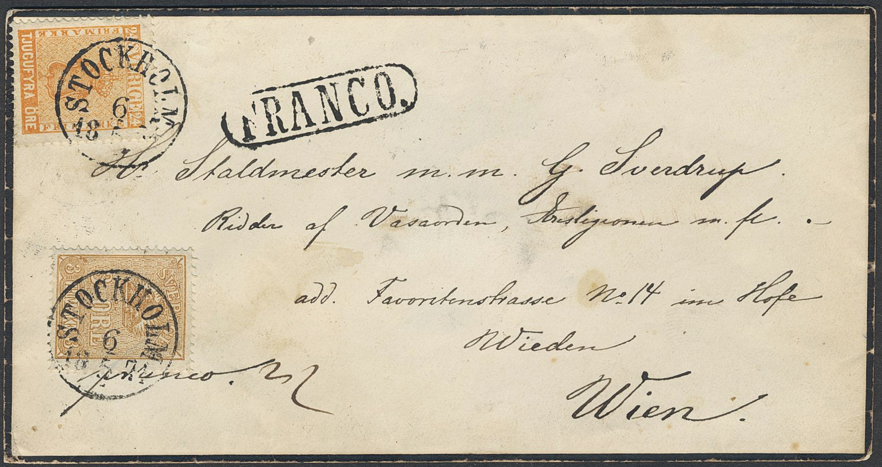 Sweden. Facit 10h2, 14Bd on cover, 3+24 öre on very fine cover sent from STOCKHOLM 6.5.1871 to Austria. Arrival pmk WIEDEN IN WIEN 10.5. Please see www.philea.se for further information.