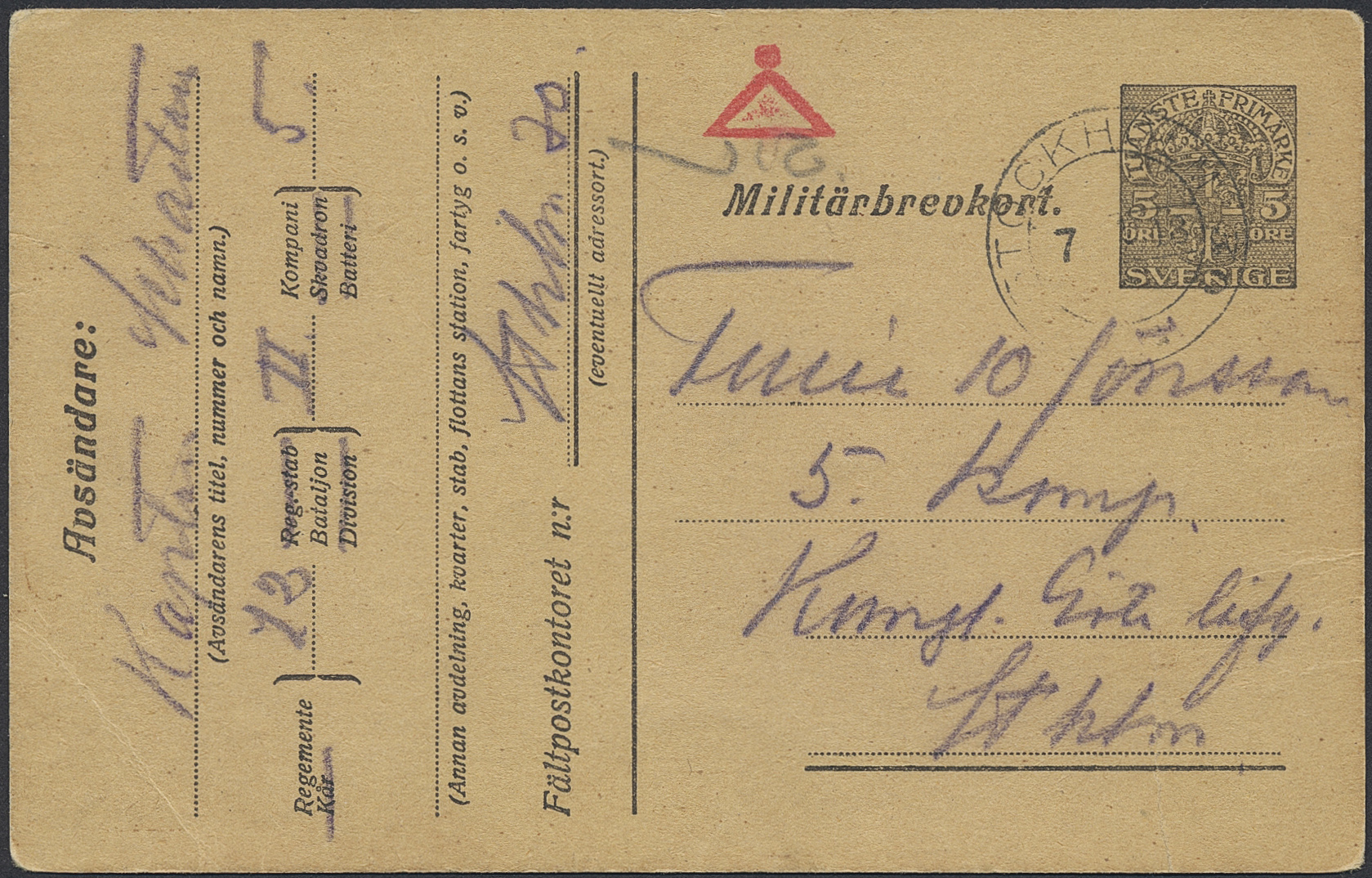 Sweden. Military postal stationary Facit MbK2, The Swedish Åland Detachement 1918. Military postcard 5 öre with red Å + censor sign, dated "X den 5 april 1918" and cancelled ”STOCKHOLM 30 7.4.18”. Sent to "Kongl. Göta lifg". SEK 2000