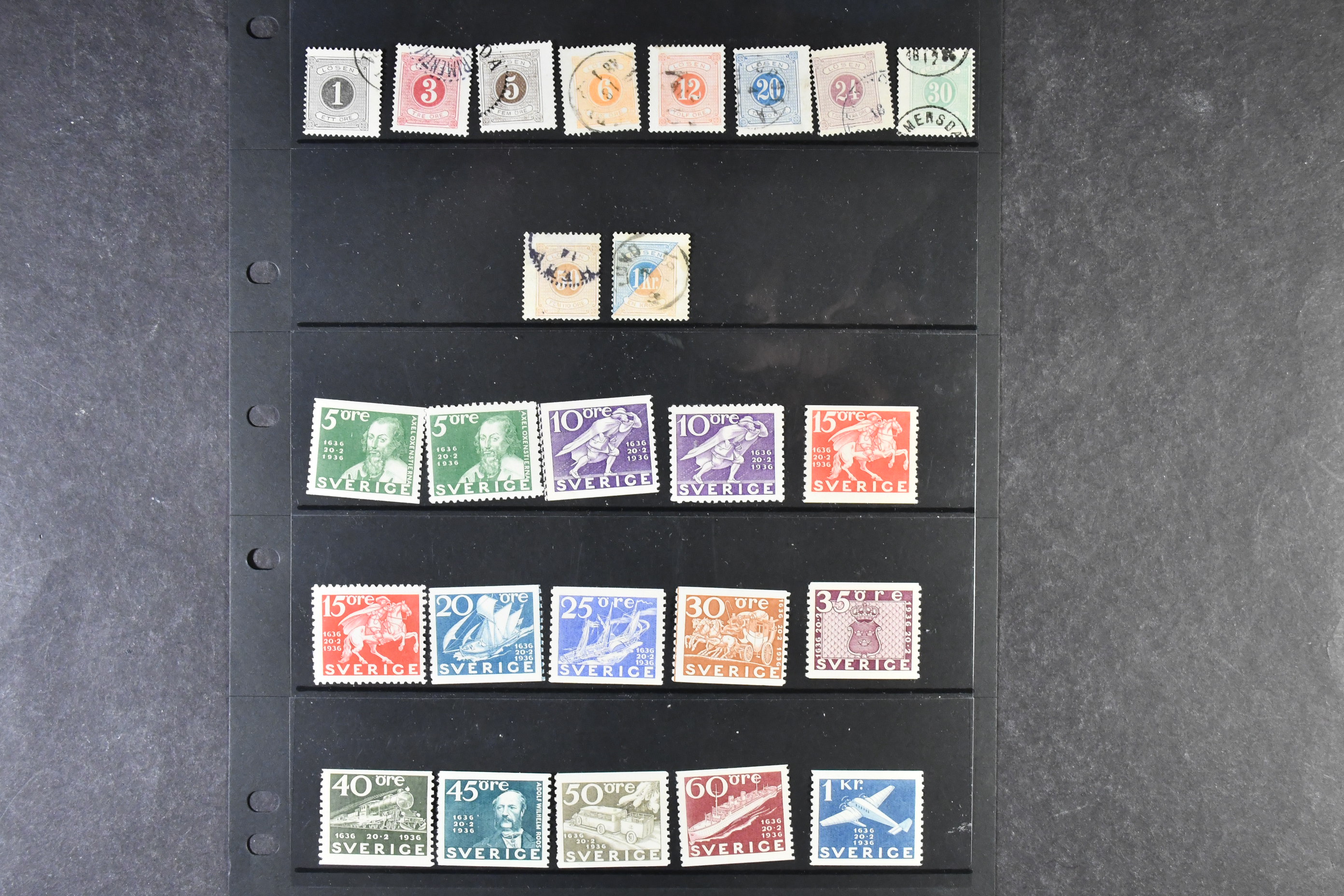 Sweden. Accumulation ★★/★/⊙ 1858–1936 on visir leaves. Mix of issues incl. e.g. Coat-of-Arms type II cpl. set, postage due cpl. sets both perf 14 and 13, large and small officials, Swedish Post 300 years and more. In total 10 visir leaves and an approval booklet. A number of fine cancellations are observed. Please see a selection of scans at www.philea.se. Somewhat mixed quality. (>200)