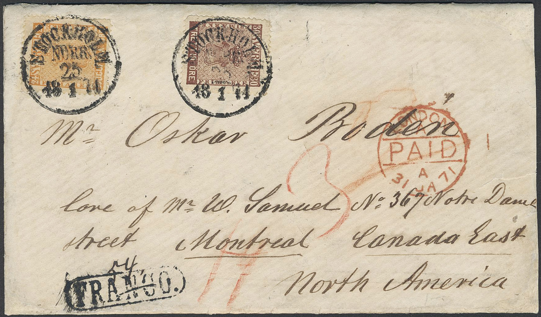 Sweden. Facit 10d2, 11d2 on cover, 24+30 öre on cover sent from STOCKHOLM 25.1.1871 to Canada, with attival pmk MONTREAL 16.FE.71.