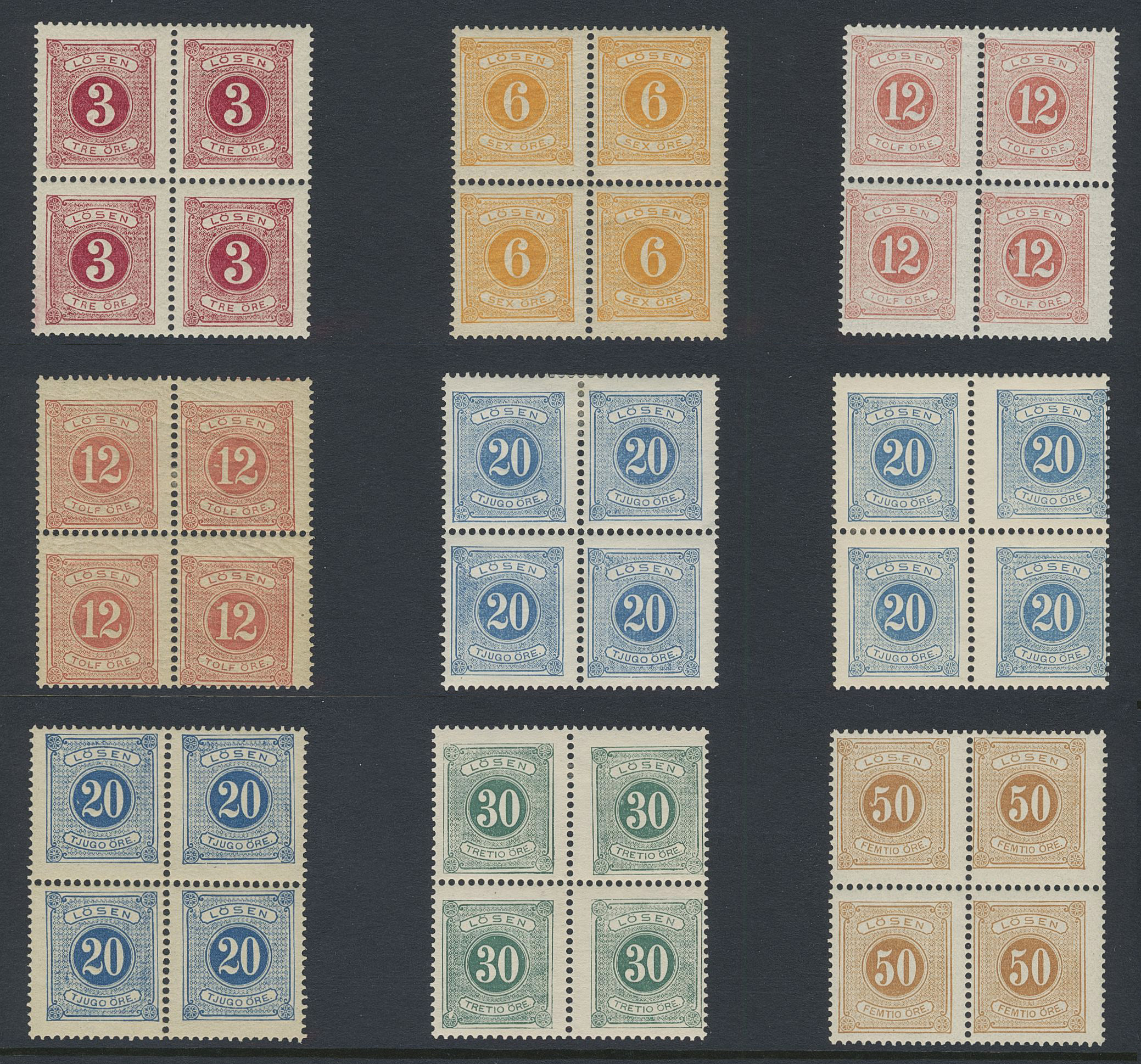 Sweden. Postage due Facit L12–19 ★★/★, Postage due stamps perf. 13 in blocks of four: 3 öre, 6 öre, 12 öre (×2), 20 öre (×3), 30 öre and 50 öre. SEK 6720