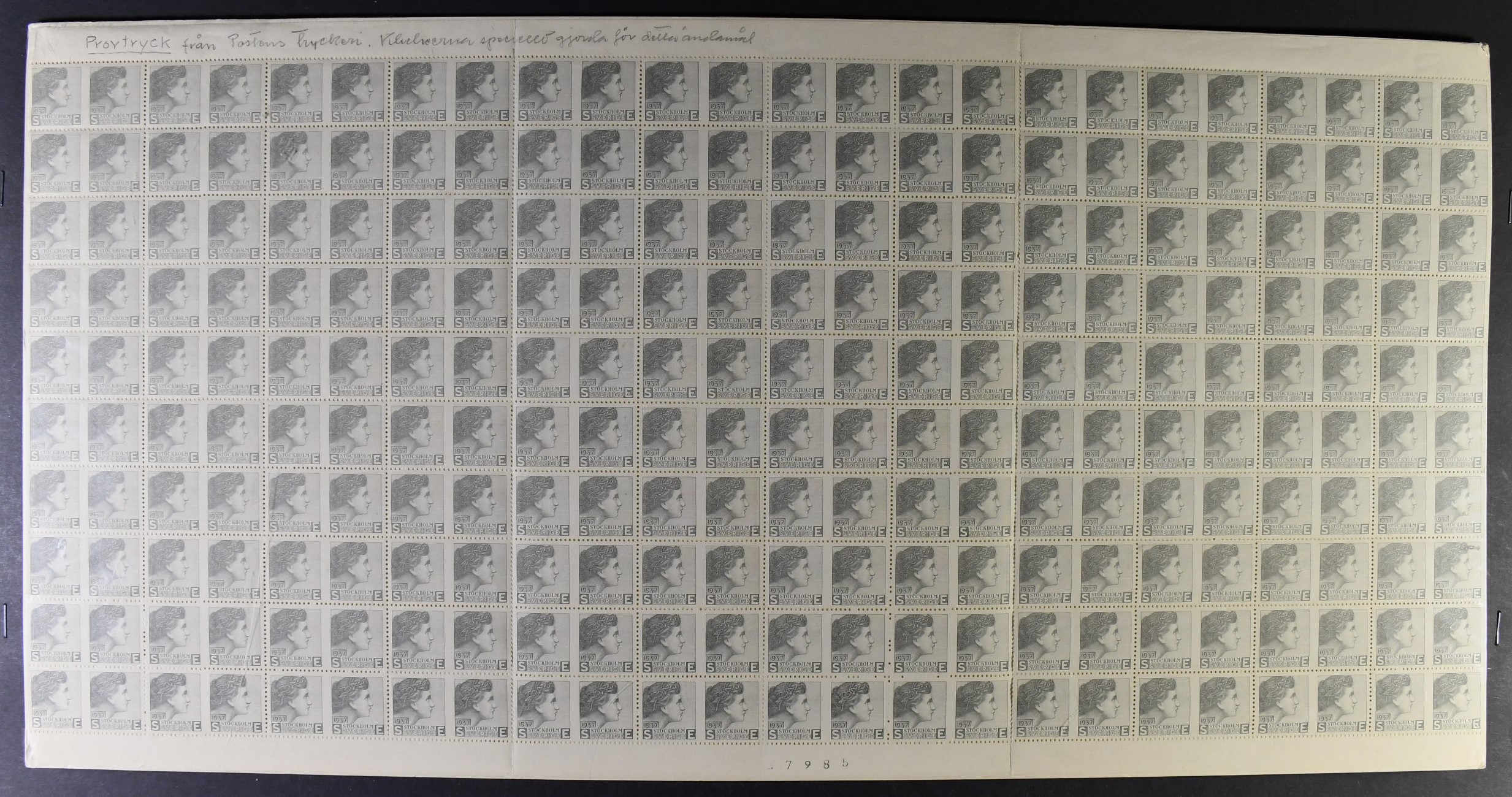 Sweden. Proof ★★, SVEN EWERT "Kvinnohuvud" in block of 240 test stamps in grey color. The large unit have upper and lower margins. Pen note "Provtryck från Postens Tryckeri. Klicheerna speciellt gjorda för detta ändamål." at top. An interesting and rare item.