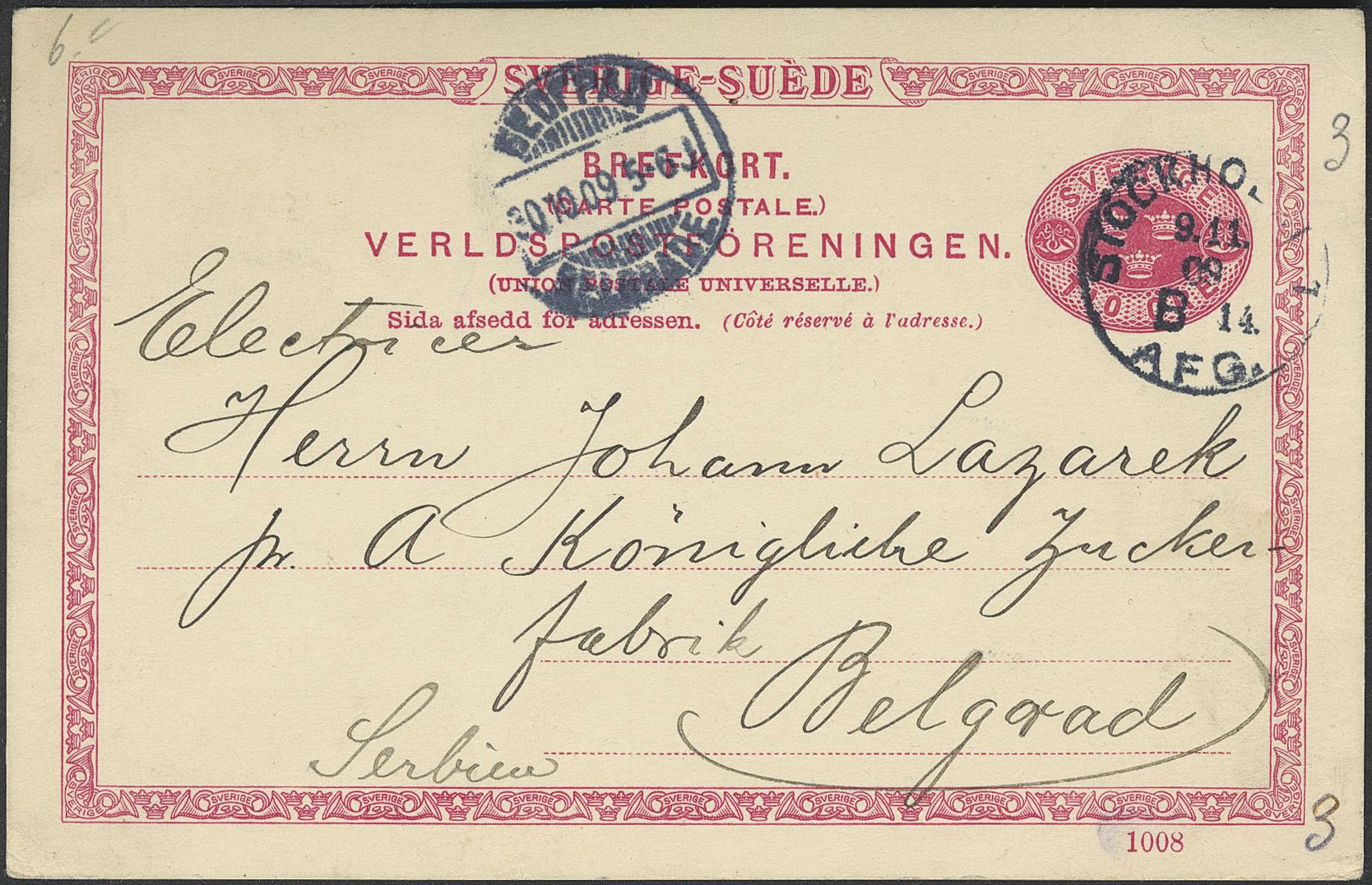 Sweden. Postal stationery, Single postcard, Facit bKe14, Postcard 10 öre with date figure 1008, sent from STOCKHOLM 9.11.09 to Serbia. Arrival pmk BELGRADE 30.10.09. Very scarce destination, only one other postcard recorded during the period according to Ferdén.