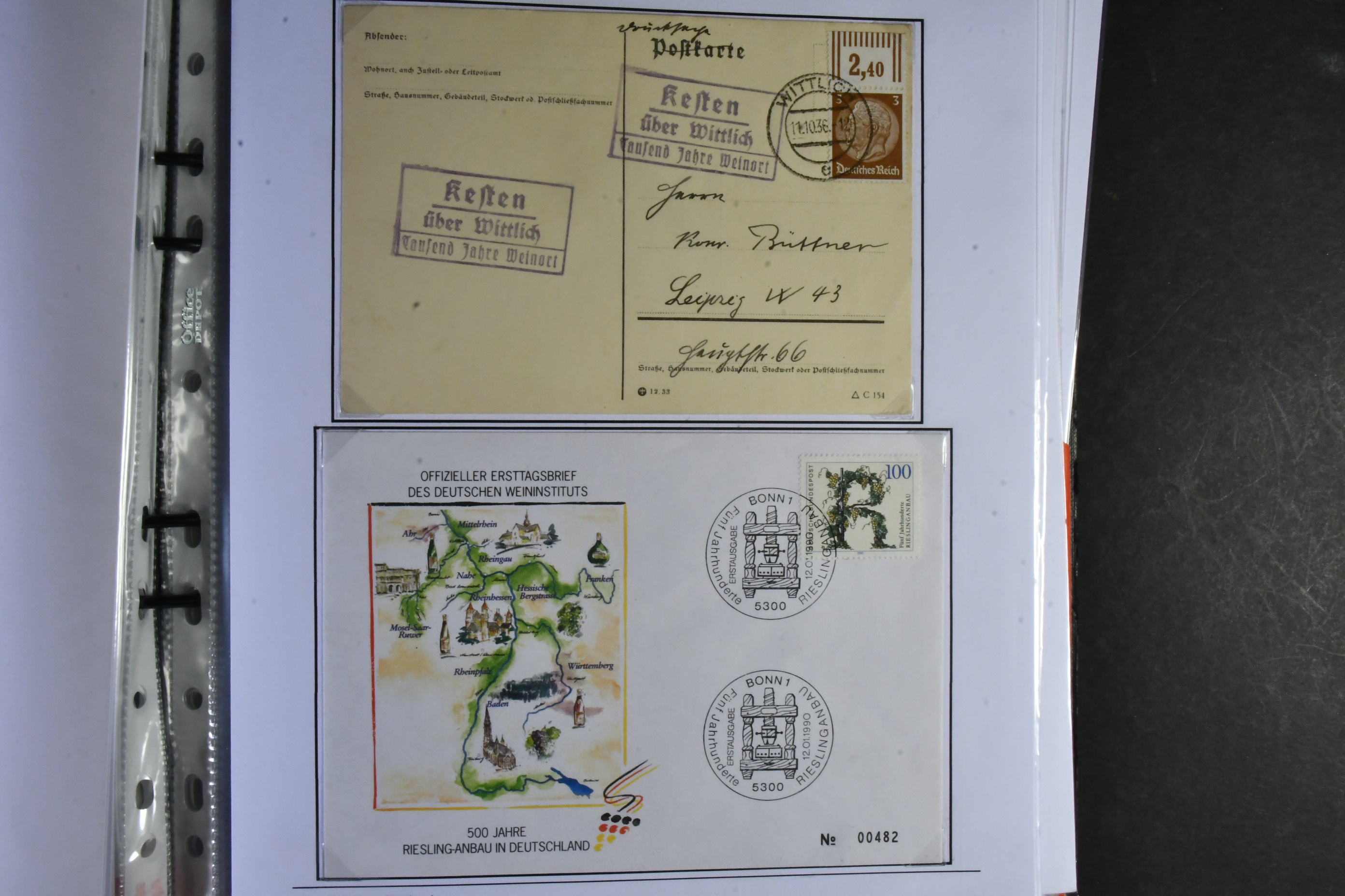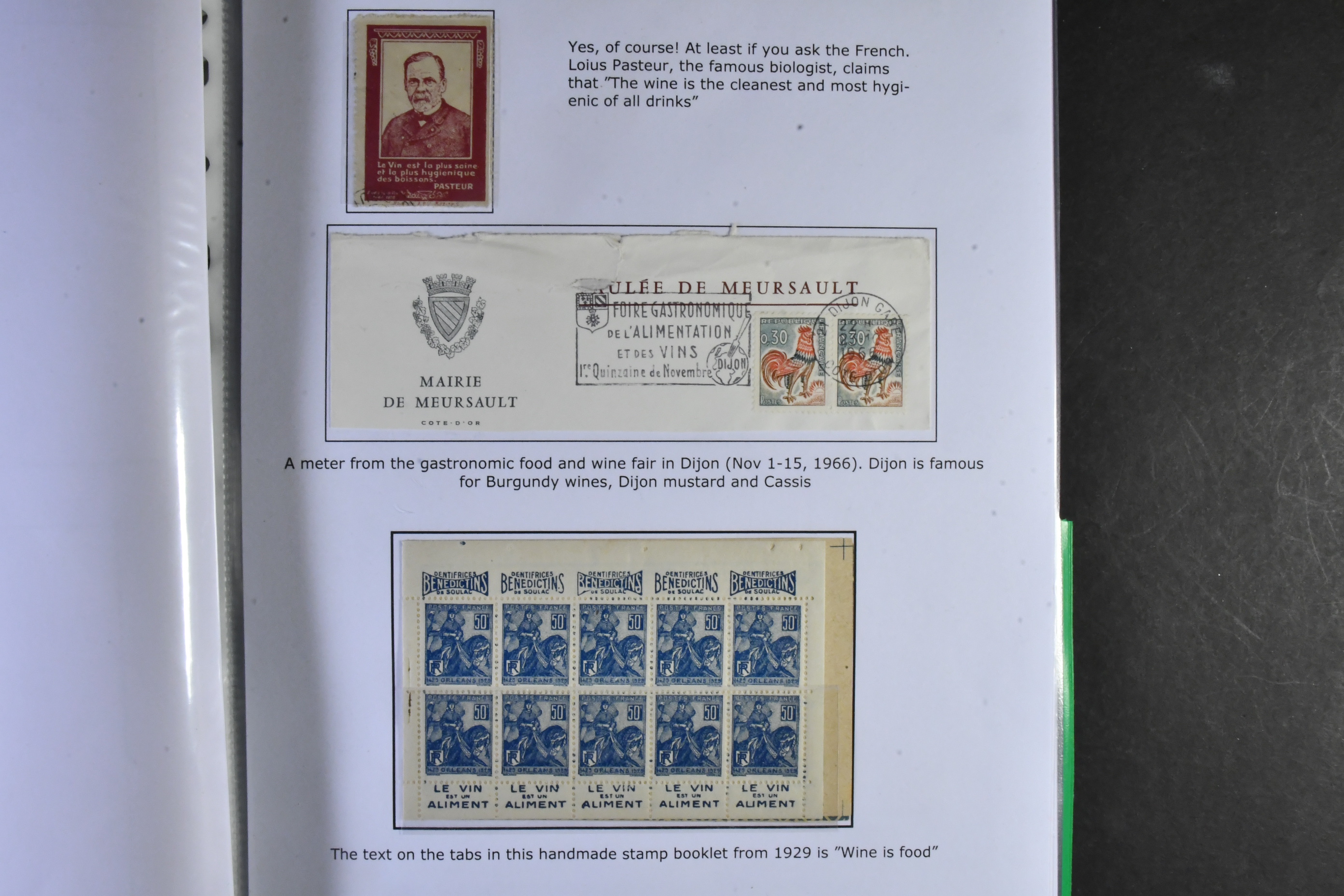 Thematics, Food and beverages. Collection ★★/★/⊙ 1900s in box. An exhibition collection (three albums) about wine in all aspects from its ancient history to modern wine use, trading wine and regulations about alcohol. The collection covers 128 album leaves size A4 (8 frames) and is complete but for one item. Many rare items included (e.g. a purchase order from 1616 and a complaint letter from 1772). The collection has been awarded a number of times in philatelic exhibitions up to the FEPA level. Please see a selection of scans at www.philea.se. Fine quality. Approx. 6 kg.