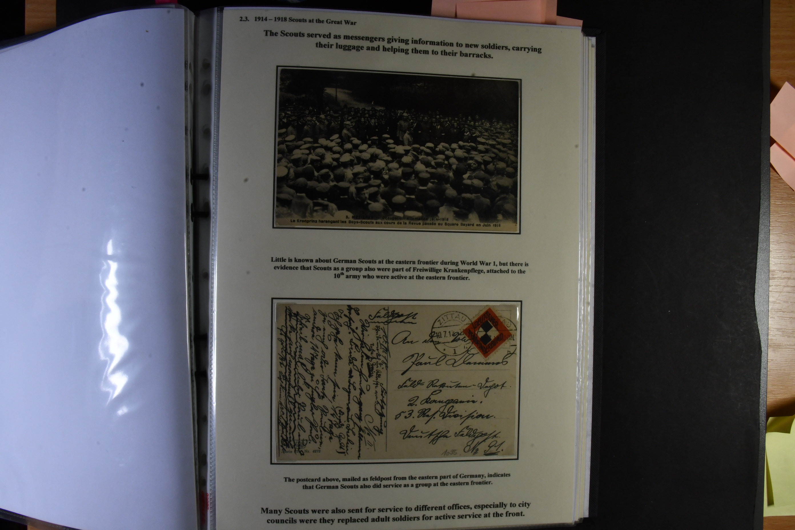 Thematics, Scouting. Picture postcards, collection 1914–1918 in two albums. The section "Scouts at World War I" from the famous exhibition collection "One World – One Promise" which was awarded mutiple times in philatelic exhibitions. A lot of very rare items, mostly picture postcards. Please see a selection of scans at www.philea.se. Fine quality.