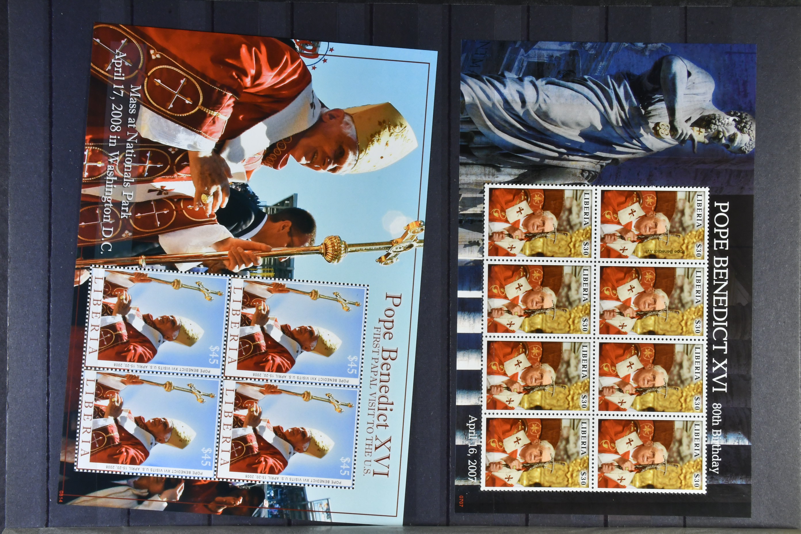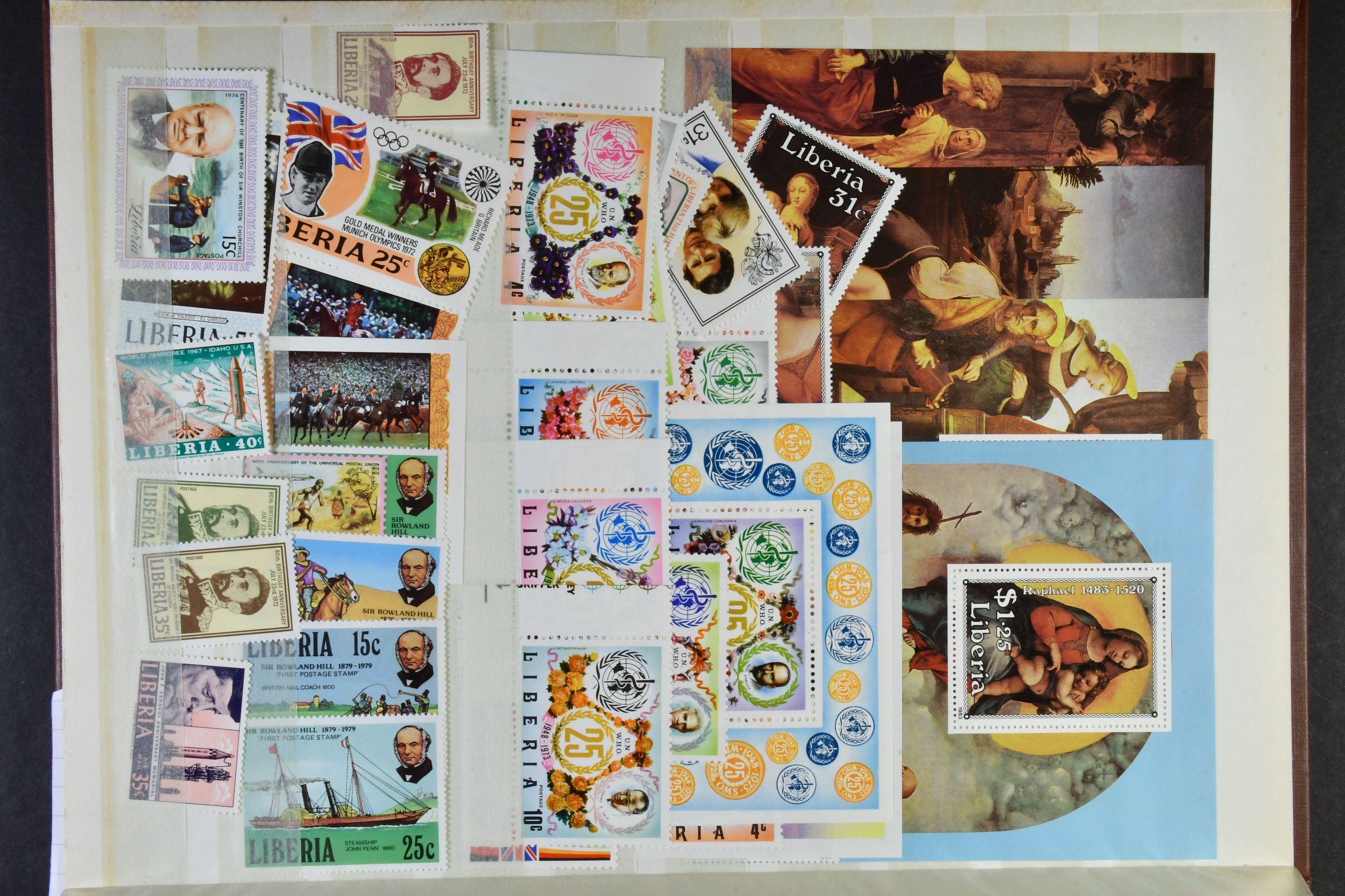 Liberia. Collection/accumulation ★★ 1940s–about 2010 in four stockbooks. Comphensive range of sets and souvenir sheets with some but not at all disturbing duplication. E.g. imperf s/s and seldom seen modern material. Excellent quality. Approx. 6 kg. (thousands)