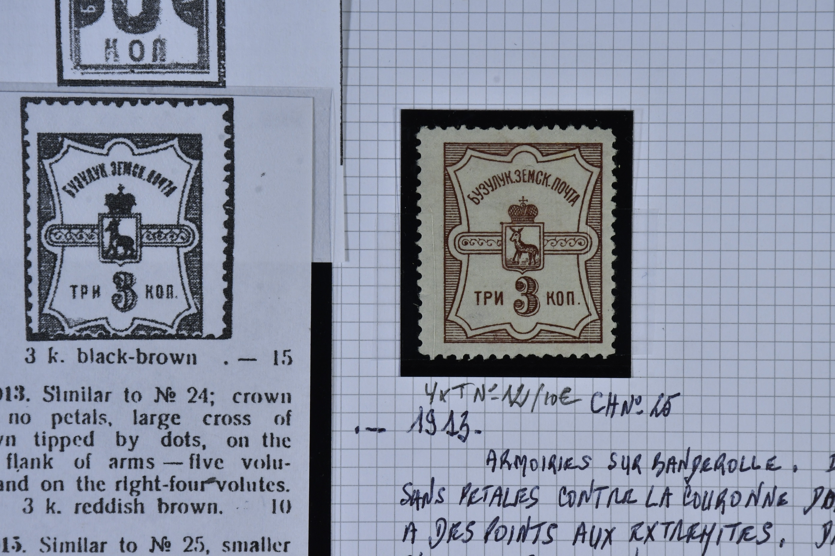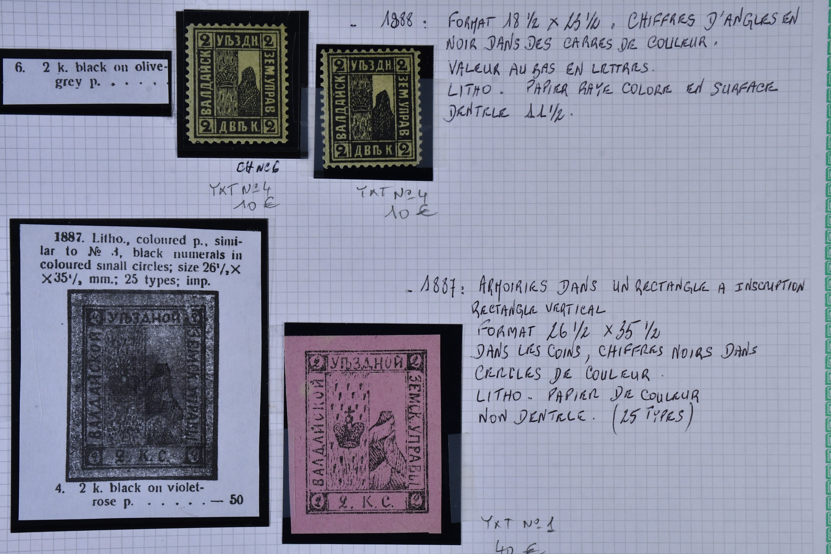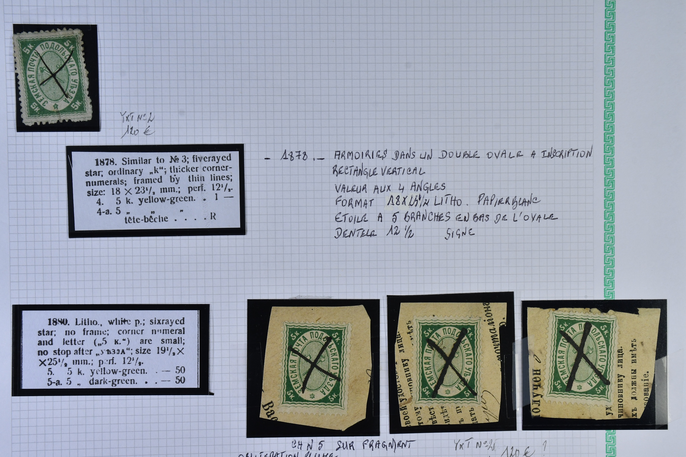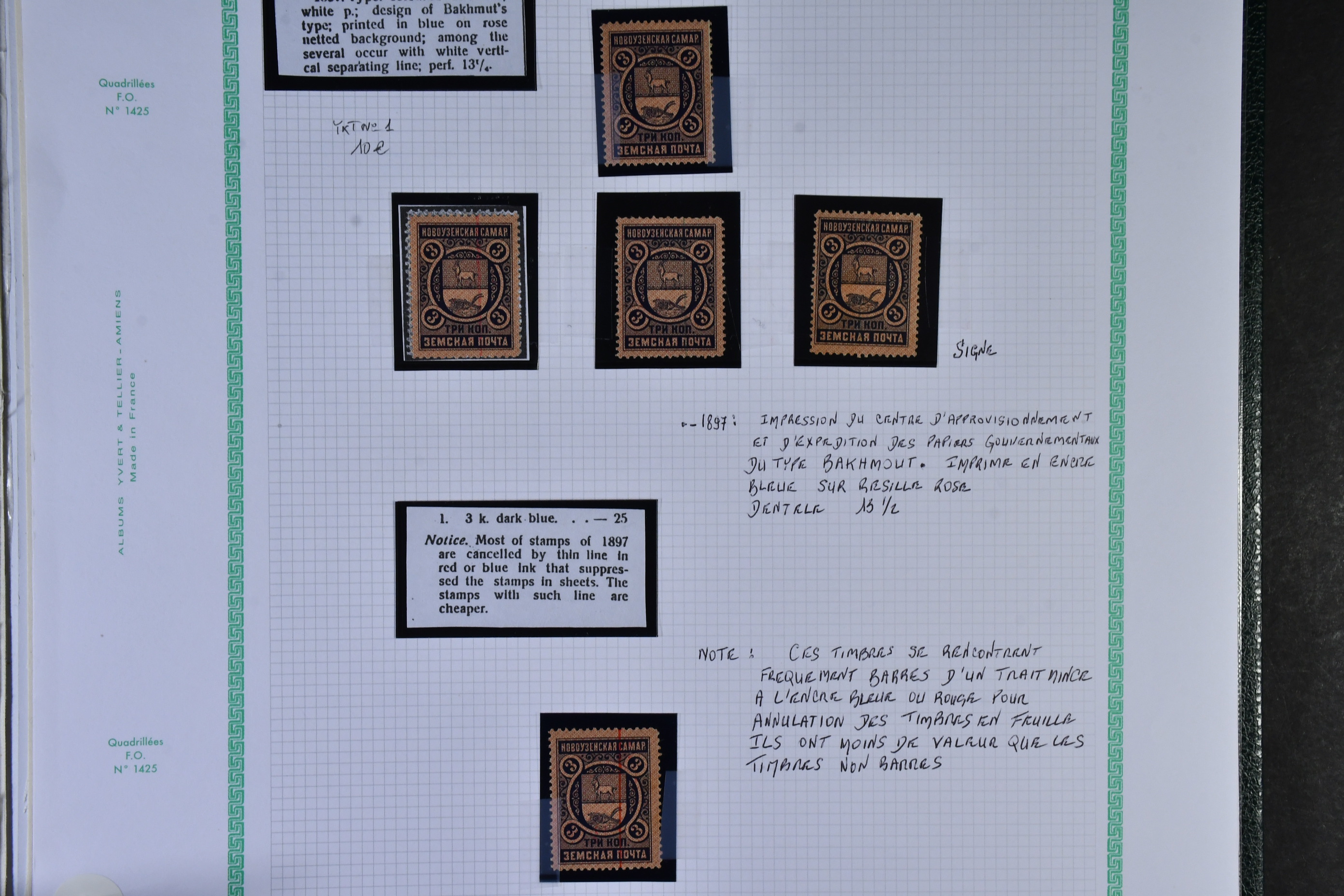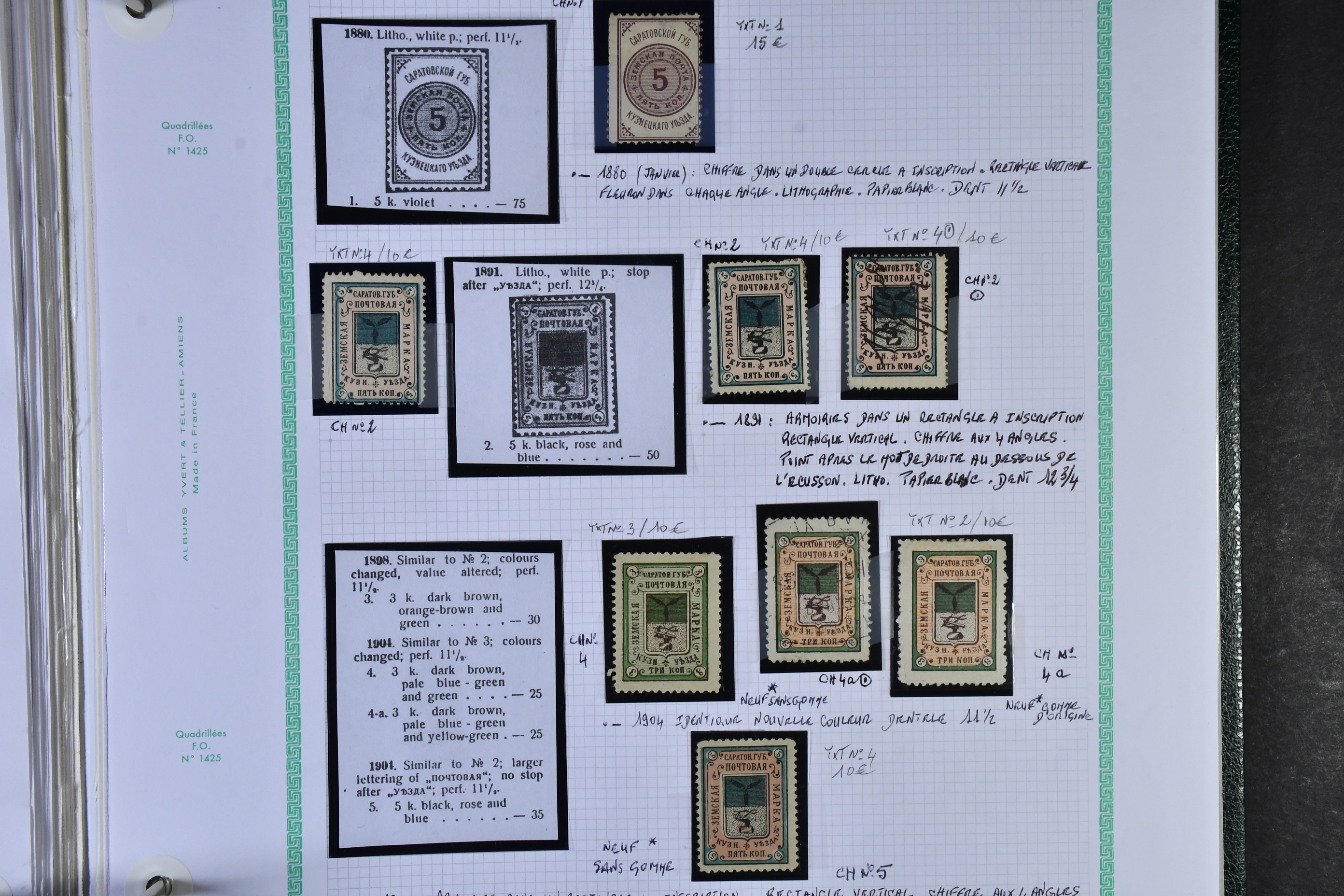 Russia, zemstvo local post. Mostly ★. A lifetime's work, extensive mint and used, accompanied by hand drawn maps, diagrams, extensive, research, beautifully written up. This is one of the best Zemstvos collection we have ever offered, all housed in 5 albums. Album 1 has Ardatof, Arzamas, Bielozersk, Bielozersk, Borovichy, Kirillof, Novgorod, Cherepovets, Bogorodsk, Bronnytzy Kolomna, Podolsk, Valdai, Petrolzavodsk, Pudozh, Yelets, Livney, Belebey and Penza with 148 stamps. Album 2 has Akhtyirka, Orgheff, Soroki, Kozelets, Bakhmut, Kharkov, Starobyelsk, Sumy, Valki, Volchansk, Alexandria, Anaief, Kherson, Yelisavetgrad, Odessa, Kologrief and Vetluga with 71 stamps. Album 3 has Borisoglyebsk, Shatsk, Lebedian, Morshansk, Byezhetsk, Rzhef, Ostashkof, Twer, Vessigonsk, Glazof, Kotelnich, Malmyzh, Molinsk, Urzhum, Sarapui, Viatka, Griazovets, Kadnikof, Ustsysolsk, Totma, Velsk, Bobrof, Ostrogozhk and Zemliansk with 216 stamps. Album 4 with Athkrsk, Godof, Luga, Novayaladoga, Bugulma, Bugurusian, Novouzensk, Stavropol, Balashof, Khvalynsk, Kuznetsk and Krasny with 78 stamps. Finally, book 5 with Shadrinsk, Yekaterinburg, Irbit, Kamyishlof, Okhansk, Perm, Osa, Solikmsk, Cherdyan, Kungur, Verkhotur, Gadiach, Konstantinograd, Kremenchug, Lokhvitza, Lubuy, Pereyasiaf, Poltava, Zienkof, Zolotonosha, Porkhoi, Ostrof, Piskof, Pakoi, Dankof, Kassimof, Ryazhsk, Sapozhok and Skopia with 254 stamps. There are some fabulous Zemstvos here worth hundreds of euros each, such as Krasny large pictorials, Bobrof, Twer 2 colour imperfs, etc, etc. There are at least 767 stamps here in total. This will delight any serious collector or dealer of Zemstvos, hugely undervalued today, esepcially given the paucity of numbers printed and seen on the market, particularly in collection format. A wonderful collecting area with huge potential for the future, offered intact as received, a highly recommended viewing. Approx. 11 kg. (767)
