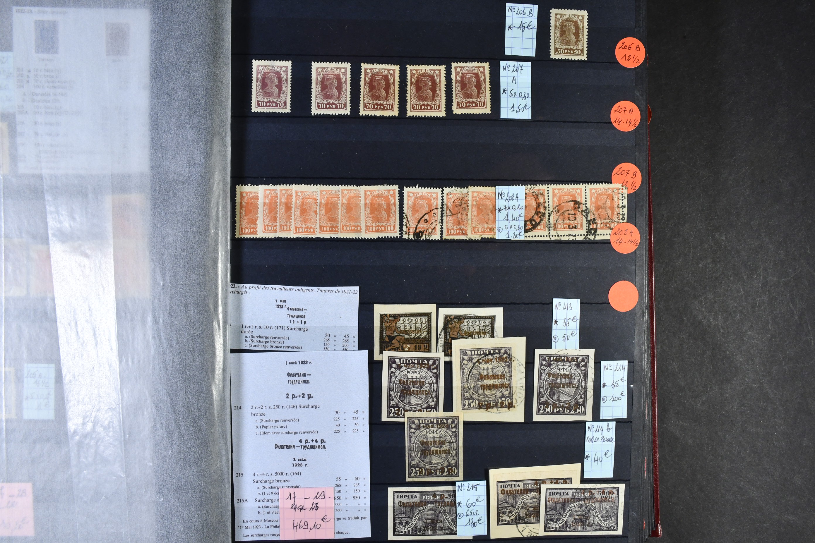 Soviet Union. ★★/★/⊙. 1000s of stamps mint and used, housed in 2 very well filled volumes from 1917 to the 1940s, starting with high values, both perf and imperfs during the revolutionary period and much back of the book, extensive in research. Perhaps with the more obvious value is the commemorative section of the 1930s, nevertheless the better collection is very probably the first volume 1917-29 with, for example, Yvert #184a wing marginal imperceptibly hinged cat €800, as well as many other better stamps of the Youth Stamp Exhibition o/ps. The inflation overprints are also so extensive inc unlisted, through to the 1923 workers defins to 5rb with both A and B types to 3rb and 5rb. Also noticed the first issues of the long Lenin high value types mint to 10rb, all differentiated inc the seldom seen #331b, etc. In the mid 1920s a good range of both perf and imperf sets mint and used with plenty of material, page after page, much identified. The second volume as indicated loaded with value and reflects the pattern of this collector, he went for material 'outside of the box', as well as basic good sets, etc. Substantial and valuable, a much recommended viewing.