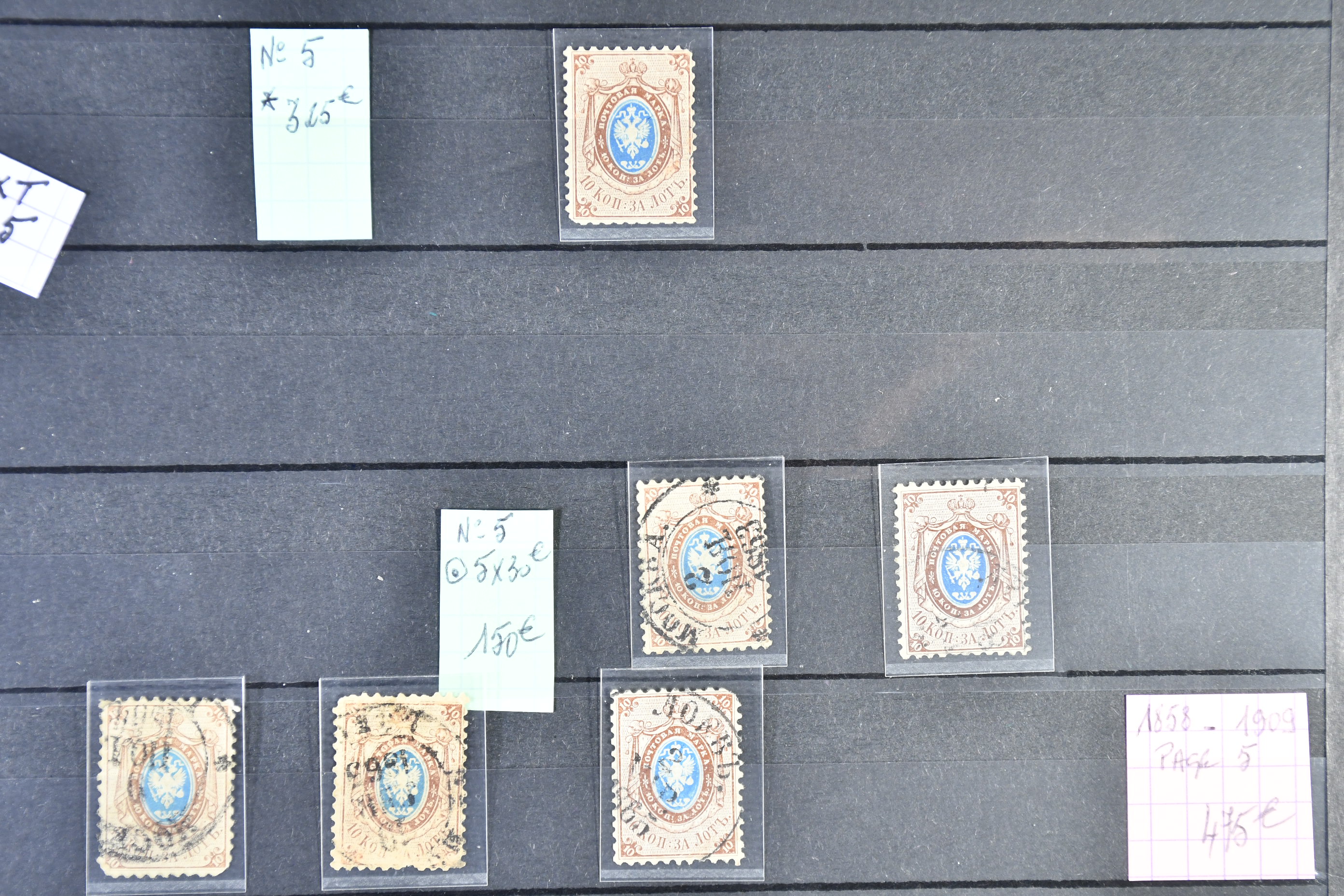 Soviet Union. ★/⊙. Useful collection housed in one volume, primarily used, all Tsarist, starting off with an impressive 4 margined #1 with straightline cancel, then 1858 types inc Yvert #5 unused, cat €300 and 5 examples used, 3x examples of #6 the 20kop, all attractive cancels, as well as #7 with number in dotted circle cancel, these alone cat over €1000. Also present same #7 unused, rich colours, small faults cat €1000, followed by 3x 1863 mint blue and black 5 kop and interestingly a used #1 Poland , pmk '17'. Further issues with manuscript cancel with a block of 4x #9, cat as singles €1000, followed by a lot of further good issues to the 30 kop, cataloguing 1000s of euro to study. There are many more of the Tsarist types to 30kop, including a good number of superb - all in all there are 1000s of stamps here chronologically organised inc #37, the 7rb without thunderbolts (with a false cancel), etc. Simply put, a great collection with so much more here, also included collateral, literature, etc. Somewhat mixed quality.