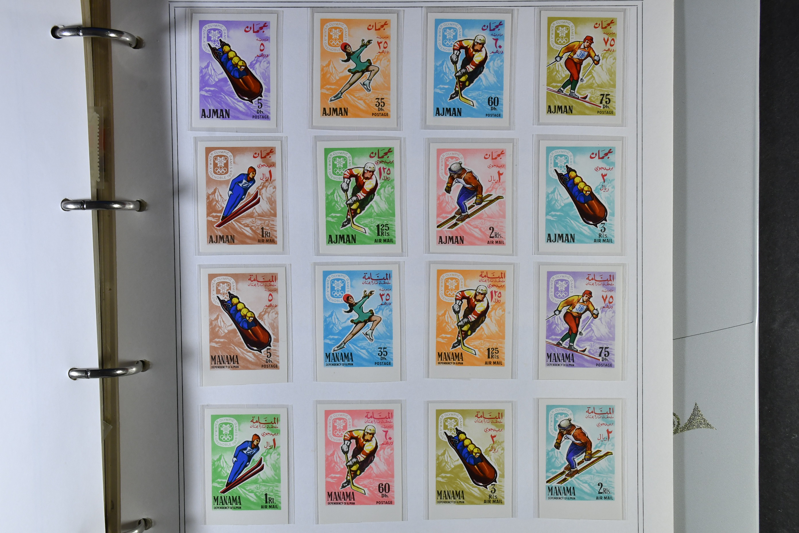Thematics, Sport. Collection mostly ★★ 1957–1968 in ten albums with stamp mounts. Very extensive for the period, the first album has mainly x satamps 1957-59 but from 2nd album starting 1962 more or less all is xx. A wealth of sets and souvenir sheets from all over the world incl many better ones. Also imperfs, overprints, unusual ones from Trucial states and more.Very high value and many pages are shown at www.philea.se. Fine quality. Approx. 16 kg.