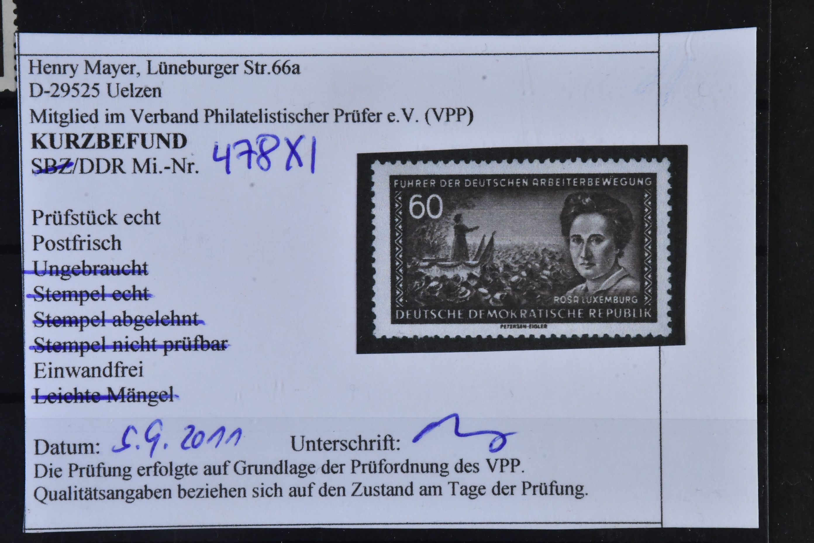 Germany, GDR (DDR). Michel 478 ★★, 1955 Workers Movement 60 pf dark brown wmk 2 XI (upright). Kurzbefund by Mayer. EUR 350