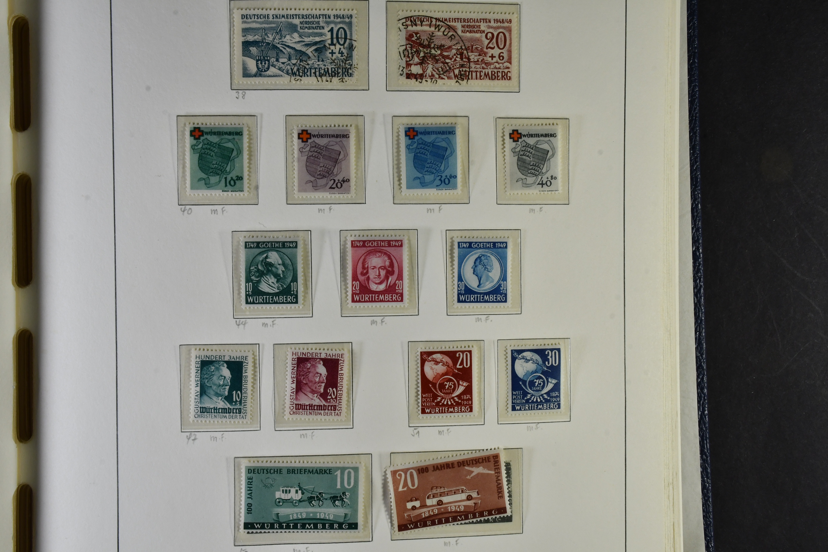 Germany, mixed. Collection mostly ★★ 1945–1969 in Leuchtturm album with stamp mounts. Starting with * common zone ncl s/s 12A+B, French zone almost cpl. mainly * but with some s/s **, Am./Br. zone incl. net overprints ** and buildings cpl. in main numbers, incl also 92A **, last but lot least BRD cpl. ** except the Post Horn set and Mi 139–40, 167–70, 189 and 197 are *. Fine quality.
