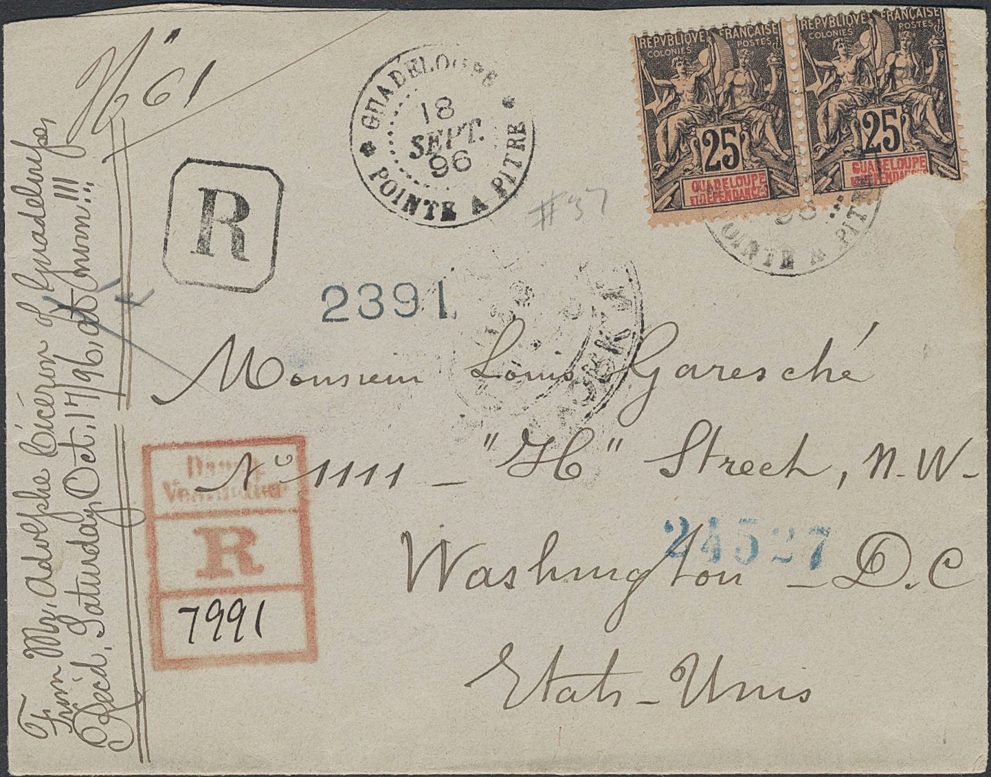 Guadeloupe. Cover, Very interesting registered cover sent to USA 1896 franked with a pair 25c tied by POINTE A PITRE 18 SEIT. 96 with transit and arrival pmks on reverse. One stamp with damage, but very clean and scarce.
