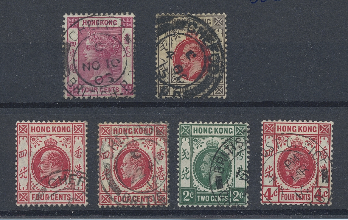 Hong Kong. Michel 110 used, 1912 King George V, First Issue $2,00 black/carmineMultiple Crown CA and five other stamps, all with Chefoo British Post Office cancels.