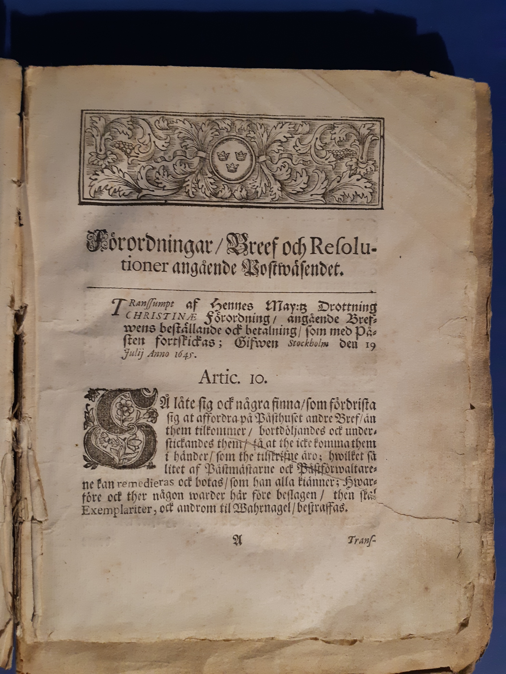 Literature. SCHMEDEMAN'S POSTAL HANDBOOK 1636–1707: 'Kongelige och andra wederbörandes förordningar angående postwäsendet ...', Stockholm, (J. H. Werner) without year (1707), 276 pp. + 'Orde-Register'. Without cover, otherwise in unusual good quality. In archive box. Very sought-after and rarely offered.