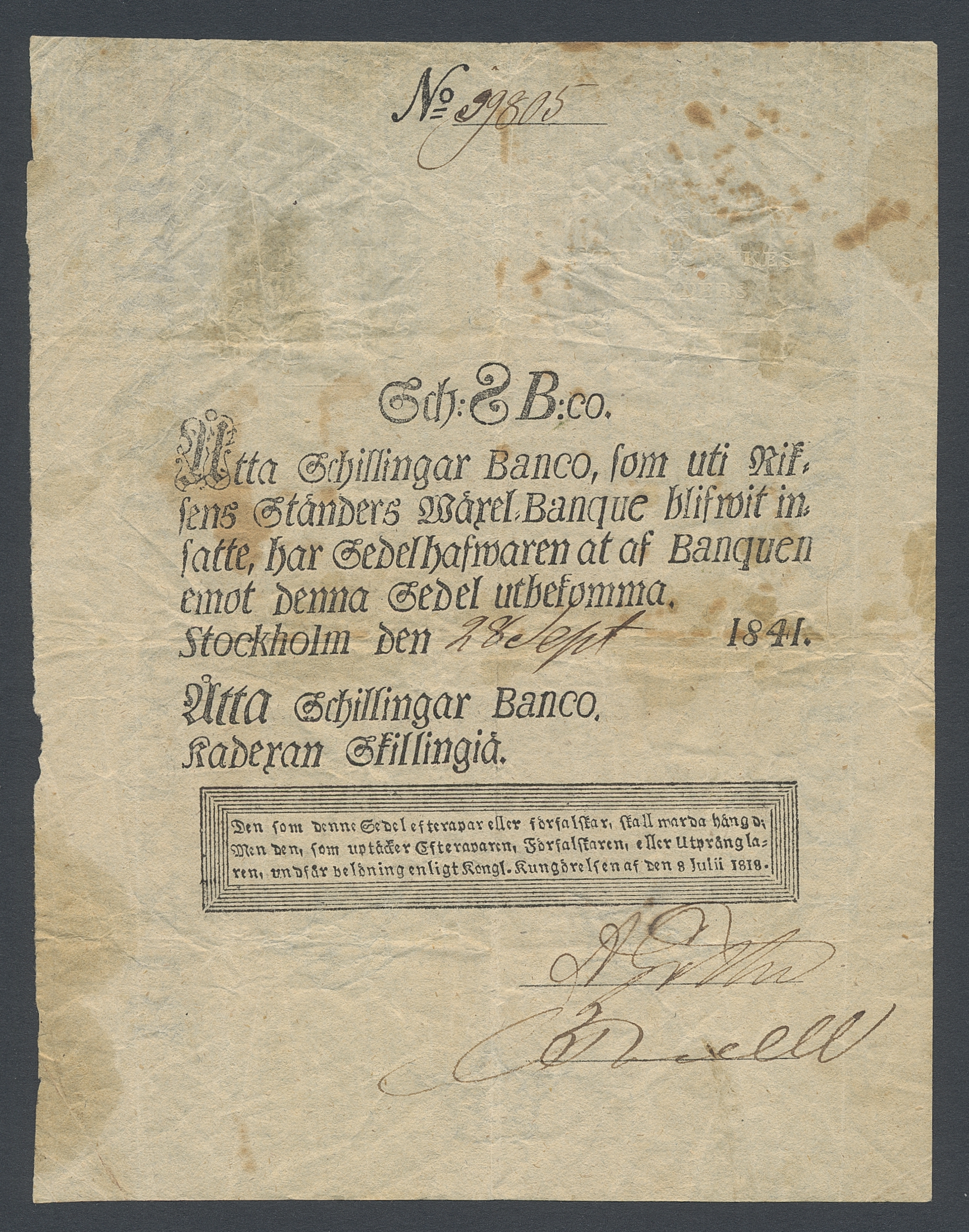 Banknotes, Sweden. 8skilling banco 1841. No: 99805. 1?