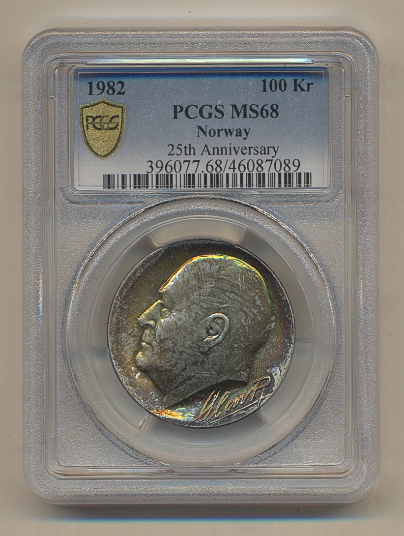 Coins, Norway. Olav V, KM 426, 100 kroner 1982. Superb example with rainbow toning. Graded by PCGS as MS68. 0. See certification at PCGS