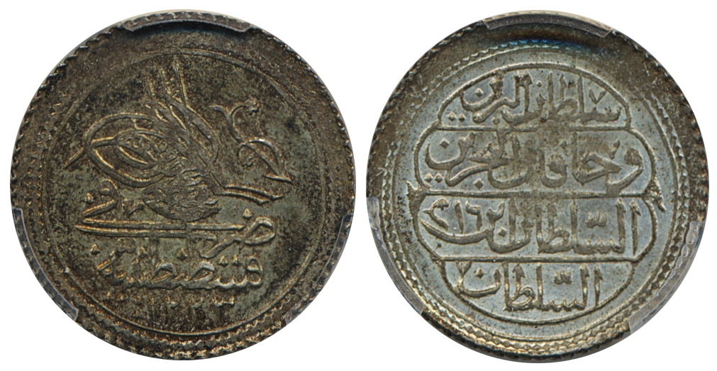 Coins, Turkey. Mahmud II (1808–1839), KM 583, 10 para 1823 (AH1223//16). Nicely toned. Graded by PCGS as MS62. XF-UNC. See certification at PCGS