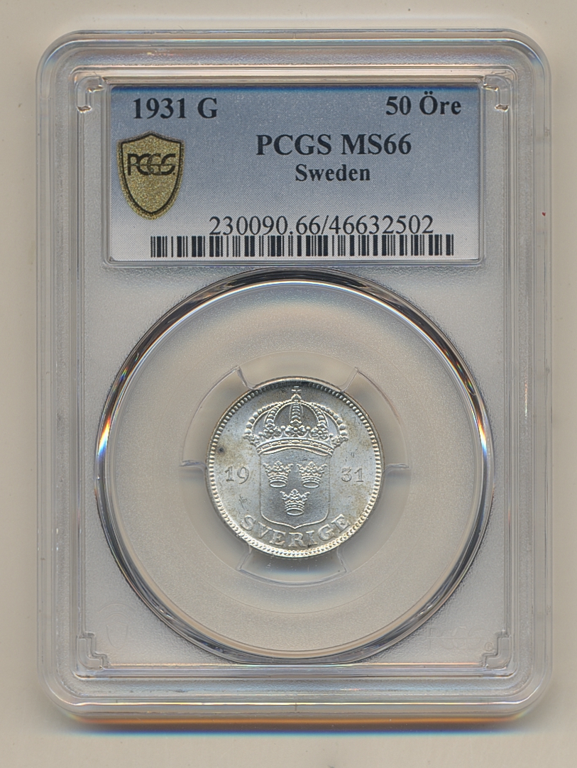 Coins, Sweden. Gustav V, MIS I.10, 50 öre 1931. Graded by PCGS as MS66. SM 83. 0. See certification at PCGS