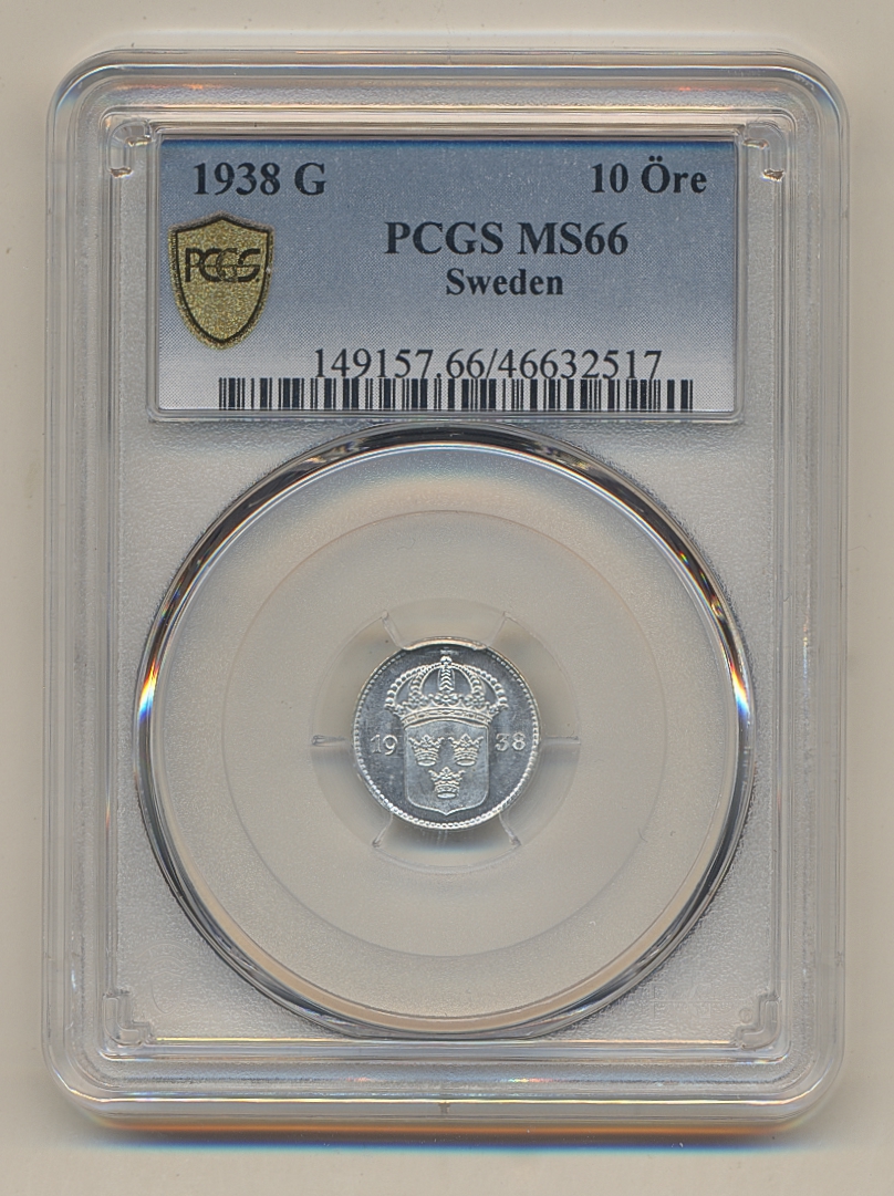 Coins, Sweden. Gustav V, MIS I.20a, 10 öre 1938. Graded by PCGS as MS66. SM 159. 0. See certification at PCGS