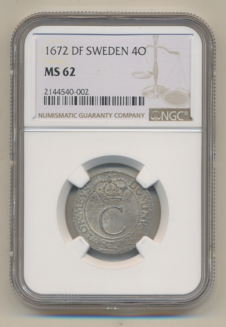 Coins, Sweden. Karl XI, SM 201c, 4 öre 1672. Stockholm. Graded by NGC as MS62. SMB 327. 01. See certification at NGC
