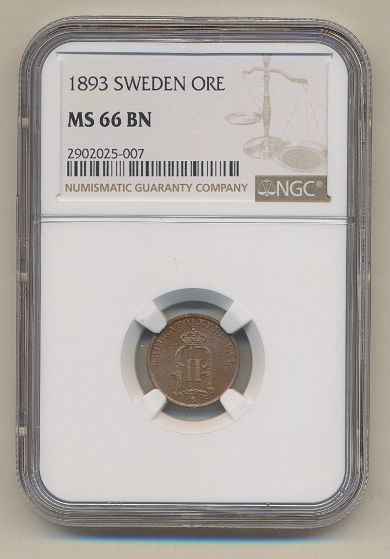 Coins, Sweden. Oskar II, MIS III.18, 1 öre 1893. Graded by NGC as MS66 BN. 0. See certification at NGC