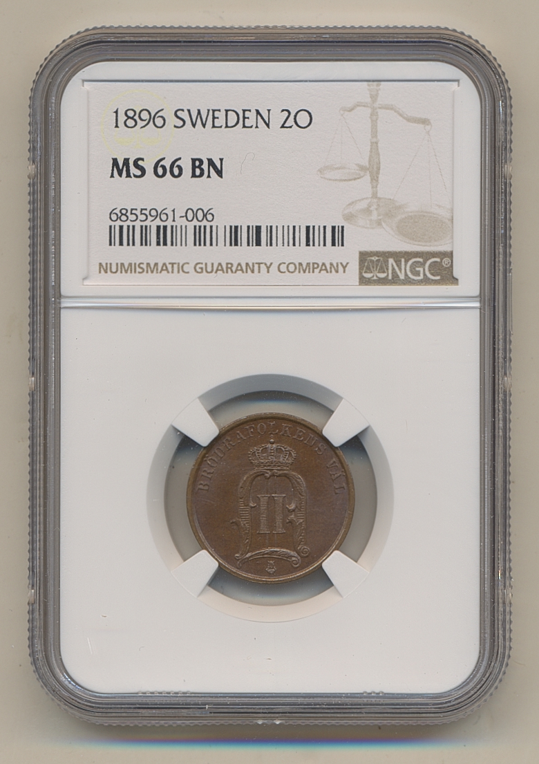 Coins, Sweden. Oskar II, MIS III.21, 2 öre 1896. Graded by NGC as MS66BN. 0. See certification at NGC