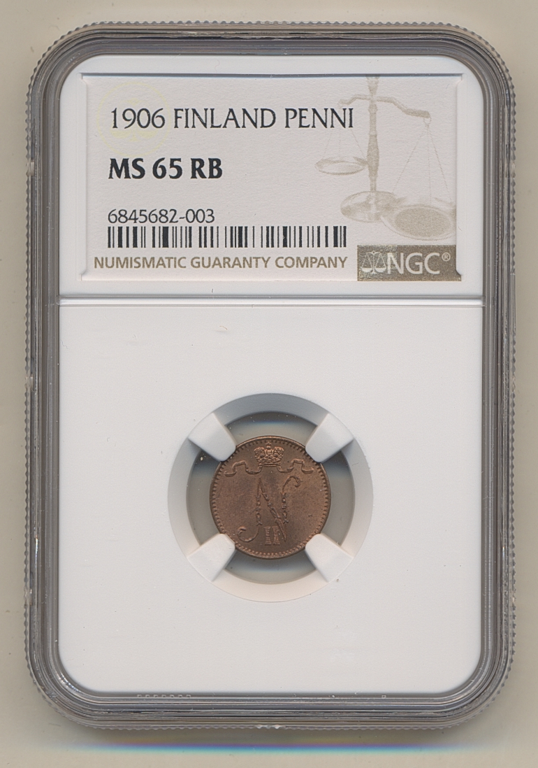 Coins, Finland. Nicholas II, KM 13, 1 penni 1906. Graded by NGC as MS65 RB. 0. See certification at NGC