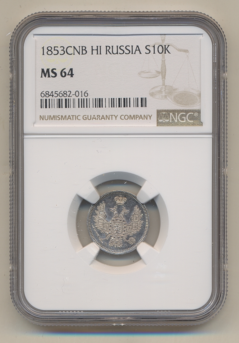 Coins, Russia. Nicholas I, Bitkin 382, 10 kopeks 1853. Graded by NGC as MS64. XF-UNC. See certification at NGC