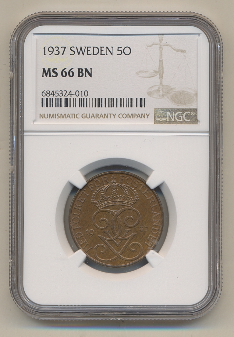 Coins, Sweden. Gustav V, MIS I.28, 5 öre 1937. Graded by NGC as MS66 BN. 0.