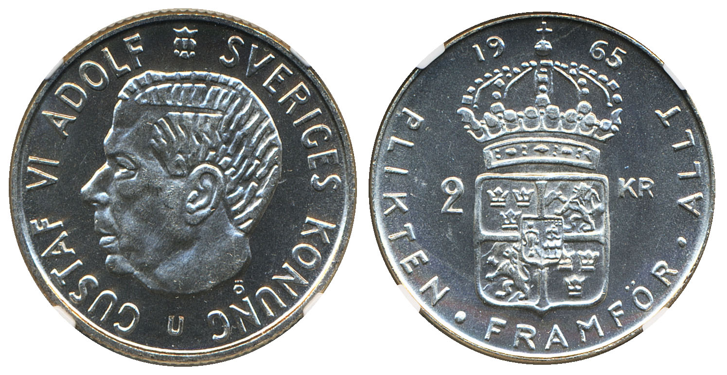 Coins, Sweden. Gustav VI Adolf, MIS I.12, 2 kronor 1965. Graded by NGC as MS67. 0. See certification at NGC