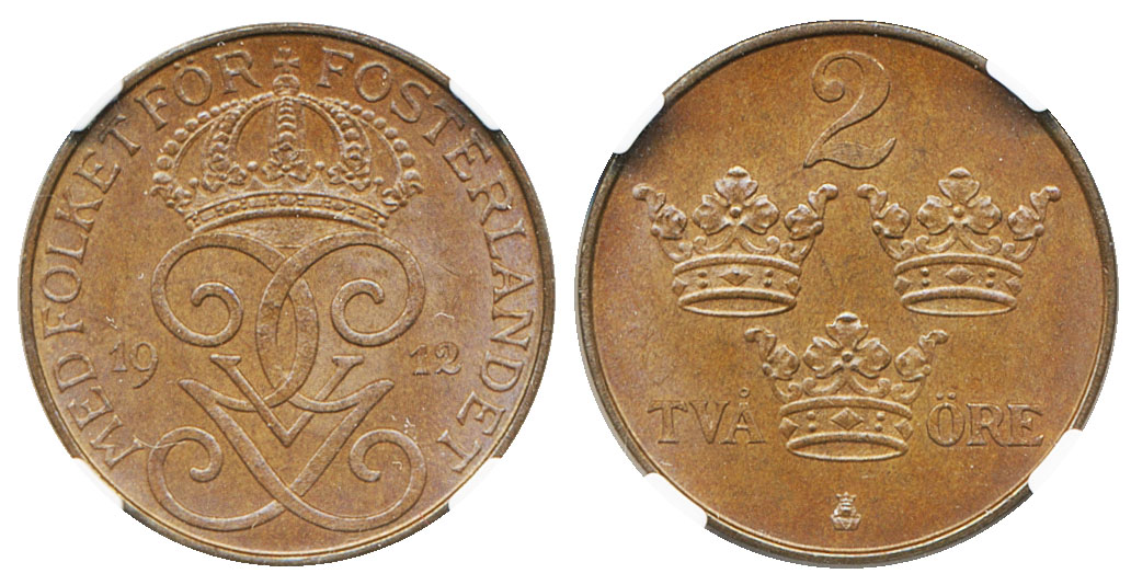 Coins, Sweden. Gustav V, MIS I.3, 2 öre 1912. Graded by NGC as MS65 BN. 01/0. See certification at NGC