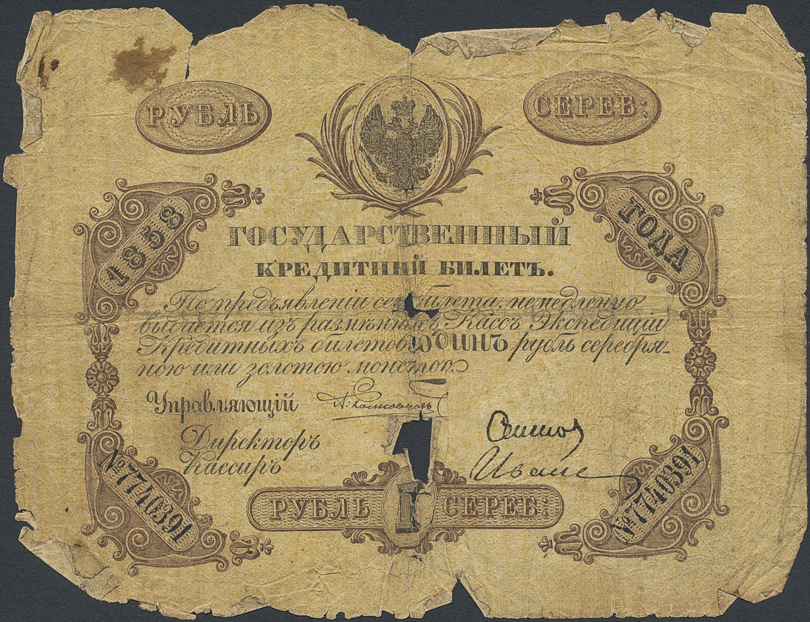 Banknotes, Russia. Pick A33a, 1 rouble 1858. No 7740391. Paper loss, many tears and some holes. Nevertheless a scarce type. G-VG.