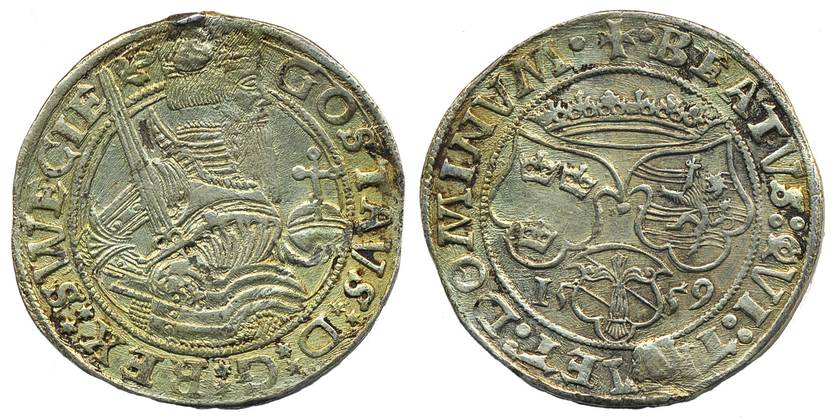 Coins, Sweden. Gustav Vasa, SM 128, 1 mark 1559. 11.68 g. Stockholm. Well struck example. Gilt example with plug/mount at 12 o'clock. Else a good example of the most scarce date of the type. SMB 65. 1+/01.