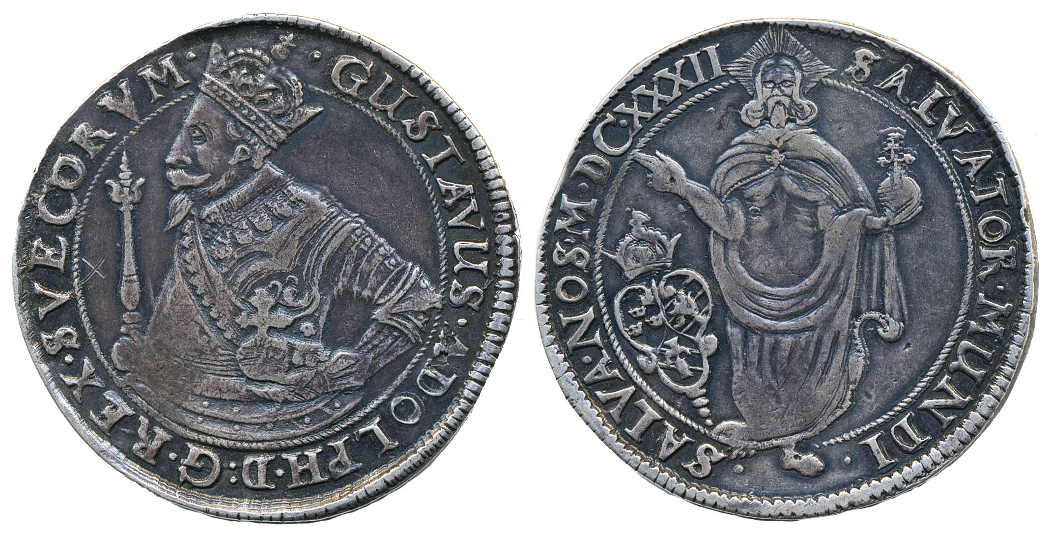 Coins, Sweden. Gustav II Adolf, SM 38b, 1 riksdaler 1632. 28.54 g. Stockholm. Variety with inverted Coat-Of-Arms. Well struck example with gray cabinet toning. A minor grafitti (X) in obverse left field, else an attractive example for the type. SMB 28. 1+.