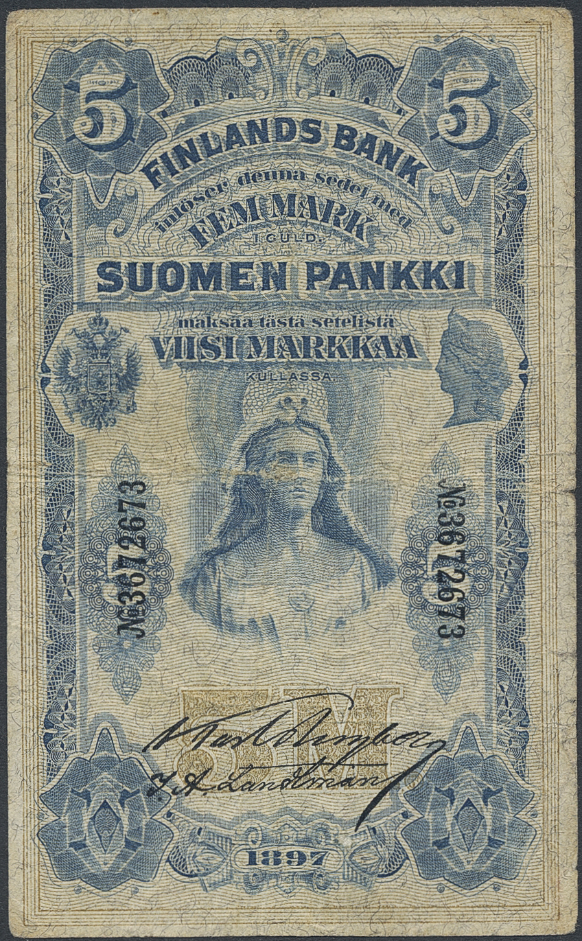 Banknotes, Finland. Pick 2, 5 markkaa 1897. No 3672673. Minor edge tears. 1?